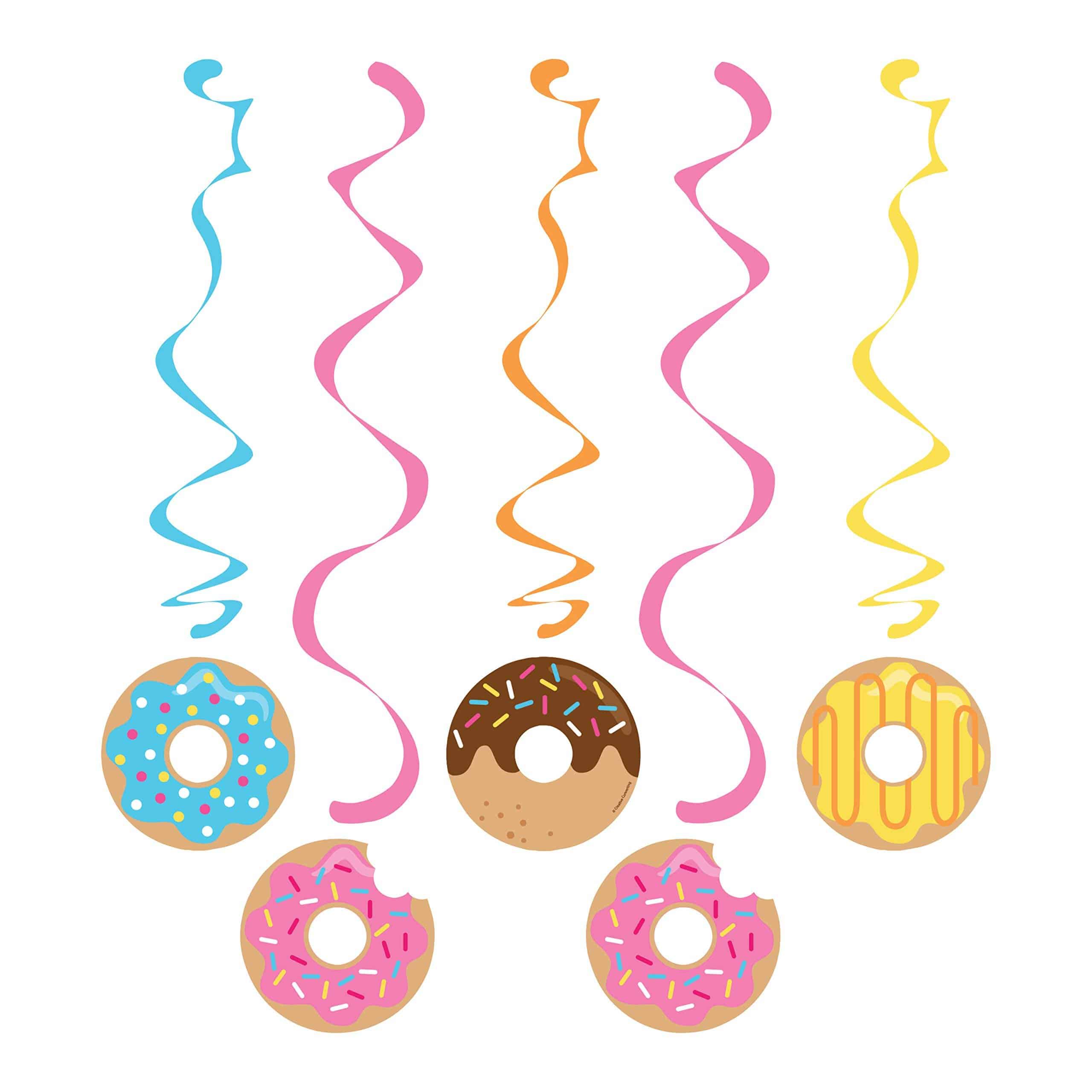 - 5 Donut Time Dizzy Danglers. Hanging decoration measures 30″ (3) and 39″ (2). Danglers are made of paper