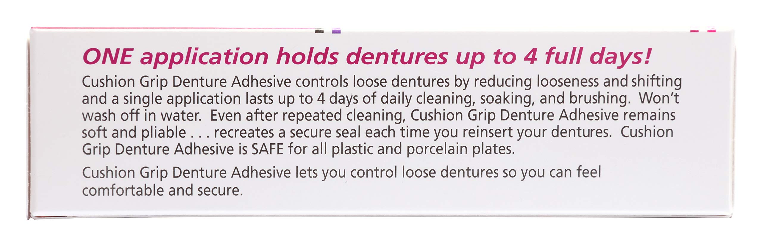 Experience the original and best thermoplastic dental adhesive for your dentures. Cushion Grip’s exclusive thermoplastic polymer formula gives denture wearers a long lasting, comfortable, secure hold for up to 4 days with a single application. 100% waterproof guarantees Cushion Grip will not wash off or breakdown in water like ordinary dental cream/paste adhesives. Even after daily cleaning, soaking and brushing, professional strength Cushion Grip recreates a secure seal each time you reinsert your dentures. Experience the best in denture comfort, experience Cushion Grip. FAQ’s Is this the same Cushion Grip Thermoplastic Denture Adhesive that was originally sold by Schering Plough and Merck? Yes, Cushion Grip is back by popular demand. USpharma has relaunched the original thermoplastic formula that Cushion Grip users loved and depended on to secure their dentures. When purchasing, look for the Cushion Grip logo with original formula on the package. Be wary of imitation brands claiming they are a Cushion Grip replacement. Made in U.S.A. Of U.S. and/or Imported Ingredients. This product does not have an expiration date.