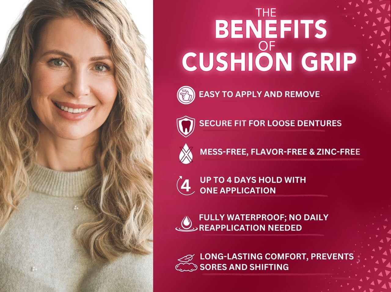 - ???Keeps Your Gums From Hurting?- The Cushioned Softness provides the gums with a cushion against denture discomfort and mouth sores. Wear dentures without pain, in comfort, and with peace of mind.