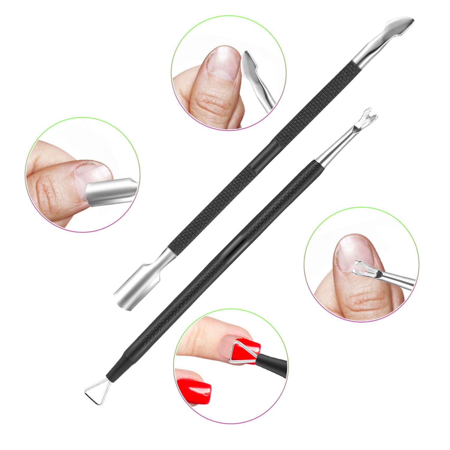 - Ergonomic Non-slip Handle Design — Our professional cuticle remover tools set is designed with an ergonomic non-slip handle, providing you with a comfortable hand feeling, you can remover the cuticles more effectively. In addition, the black design makes it a set of exquisite manicure artwork.