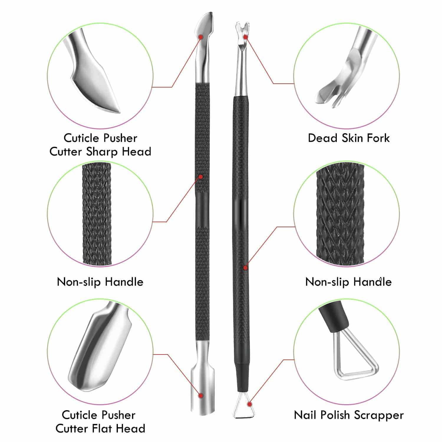 - 5 in 1 Manicure and Pedicure Tool Set — Including cuticle trimmer, cuticle pusher cutter flat head, cuticle pusher cutter sharp head, dead skin fork and triangle nail polish scraper. Use the flat head to gently push back the cuticles on your nails; Use the trimmer to neaten cuticles. Use the triangle head to peel or remove gel nail polish; Use the cuticle pusher cutter sharp head push down the cuticles at the corners of your nails. They are great beauty tools for manicure and pedicure.