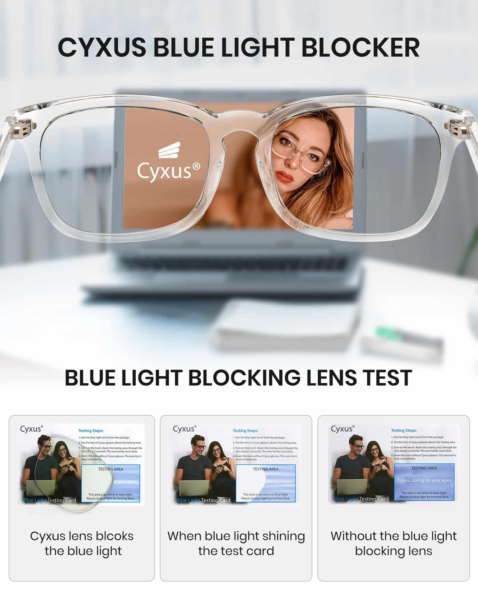 - ?GLASSES MATERIAL?Cyxus blue light blocking glasses is made in lightweight Polycarbonate square frames and PC Lenses. Our clear PC lens is 30% lighter than resin lens and 50% lighter than glass lens. At the same time, PC lenses are safer than glass lenses. Its impact resistance is 60 times that of glass lenses and through the falling ball impact test, the lens is not easy to break.