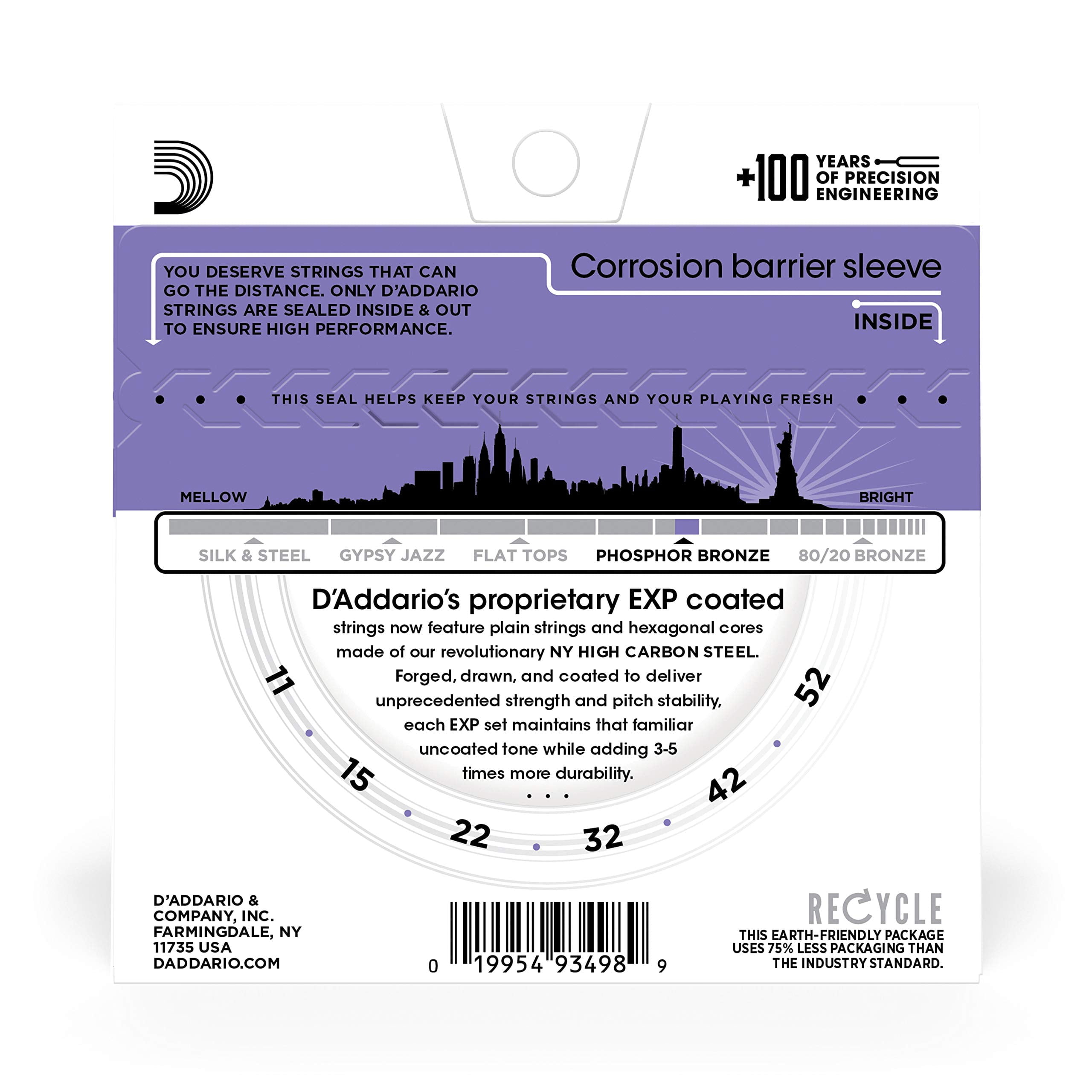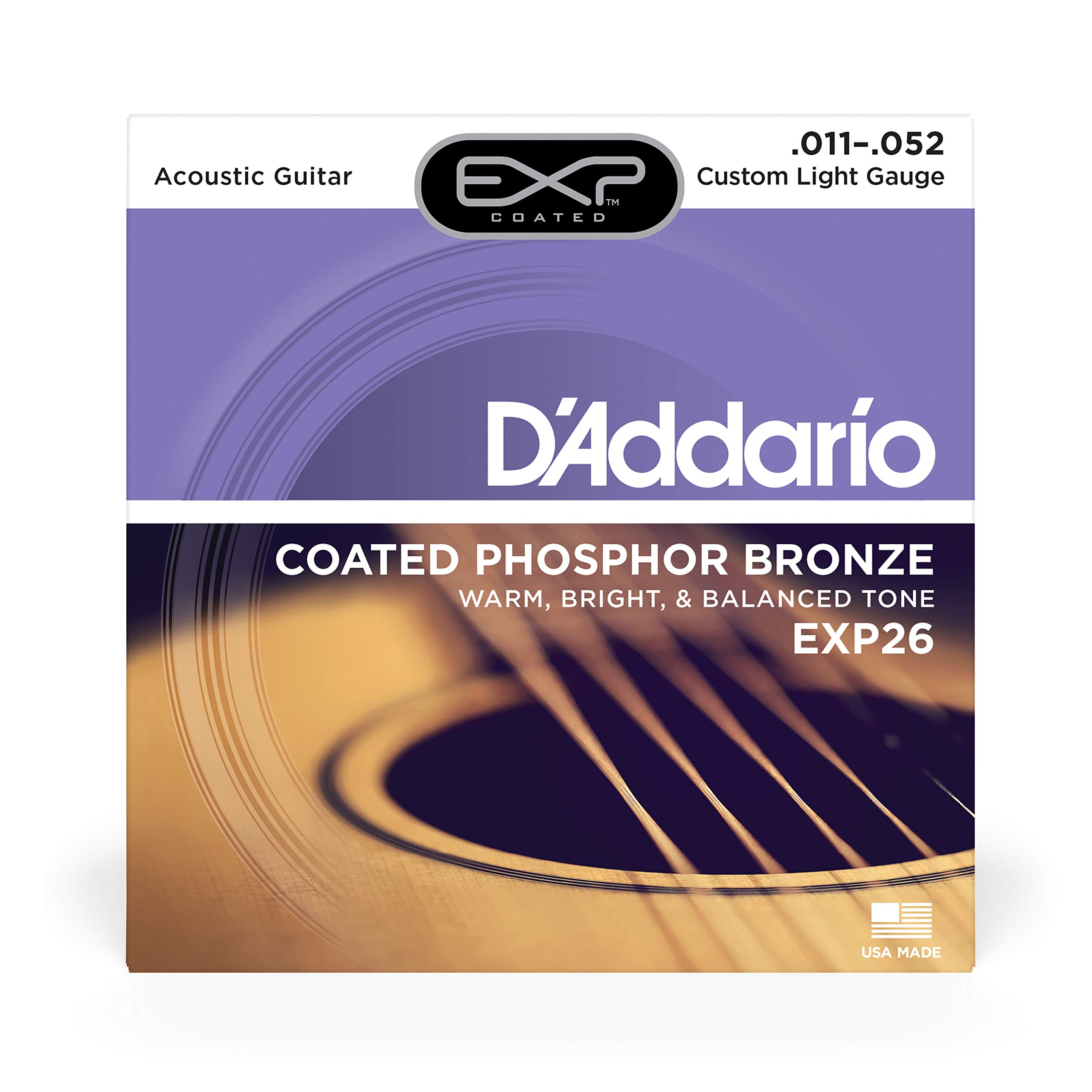 Pursue your passion with D?Addario?s most popular coated acoustic guitar string set, the EXP26 Coated Phosphor Bronze Acoustic Guitar Strings that deliver the ideal balance of volume, projection and comfortable playability. With EXP coated phosphor bronze strings you get the familiar warm, bright, well balanced acoustic tone of uncoated strings but with 4 times more life. These coated light acoustic guitar strings feature plain steel strings and hexagonal cores made of our revolutionary NY High Carbon Steel. Envisioned, perfected, and manufactured by D?Addario in New York, this break-resistant, high-carbon steel wire delivers unprecedented strength and pitch stability. Your strings will sound as good at the end of a show as they did during the first set of the night. D?Addario leverages centuries of string-making experience to bring you the most durable, consistent and enduring guitar strings. Made in the USA for the highest quality and performance, only D?Addario strings are sealed inside and out. Unlike other coated strings that are wound then coated, D?Addario strings feature an ultra-fine layer of EXP coating that is bonded to the phosphor bronze wrap wire and then wound onto the hex-shaped core wire. The result is a barrier against corrosion and a consistent, long-lasting tone. And thanks to the corrosion resistant packaging, the strings are always fresh. The string gauges in this acoustic string set include: String Gauges: Plain Steel .011, .015, Phosphor Bronze Wound .022, .032, .042, .052 Since 1905, D?Addario has been providing artists and players with the tools they need to perform their magic. As musicians ourselves, we have the unique ability to engineer products that inspire other musicians. The D?Addario family?s vision, creativity, passion and tradition have made us the world?s largest musical instrument string manufacturer. We put our family?s heart, soul and love for making music into every string and instrument accessory we create, and we never stop inspiring performance.