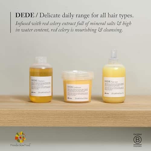 Delicate daily shampoo for all hair types. A lightly-foaming gel, DEDE/shampoo is formulated with red celery extract to maintain clean, shiny, balanced hair.