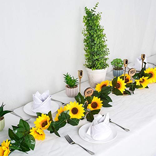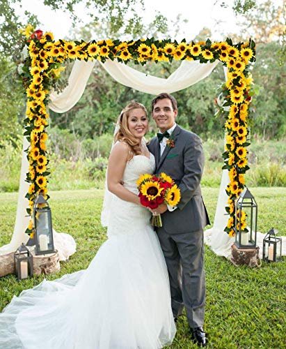 - SIZE: Each garland 7.4 FT long,flowers 4 inches in diameter,each garland holds 72 leaves,8 flowers.the perfect way to accent your wedding, There is two pack of artificial sunflower garland per package