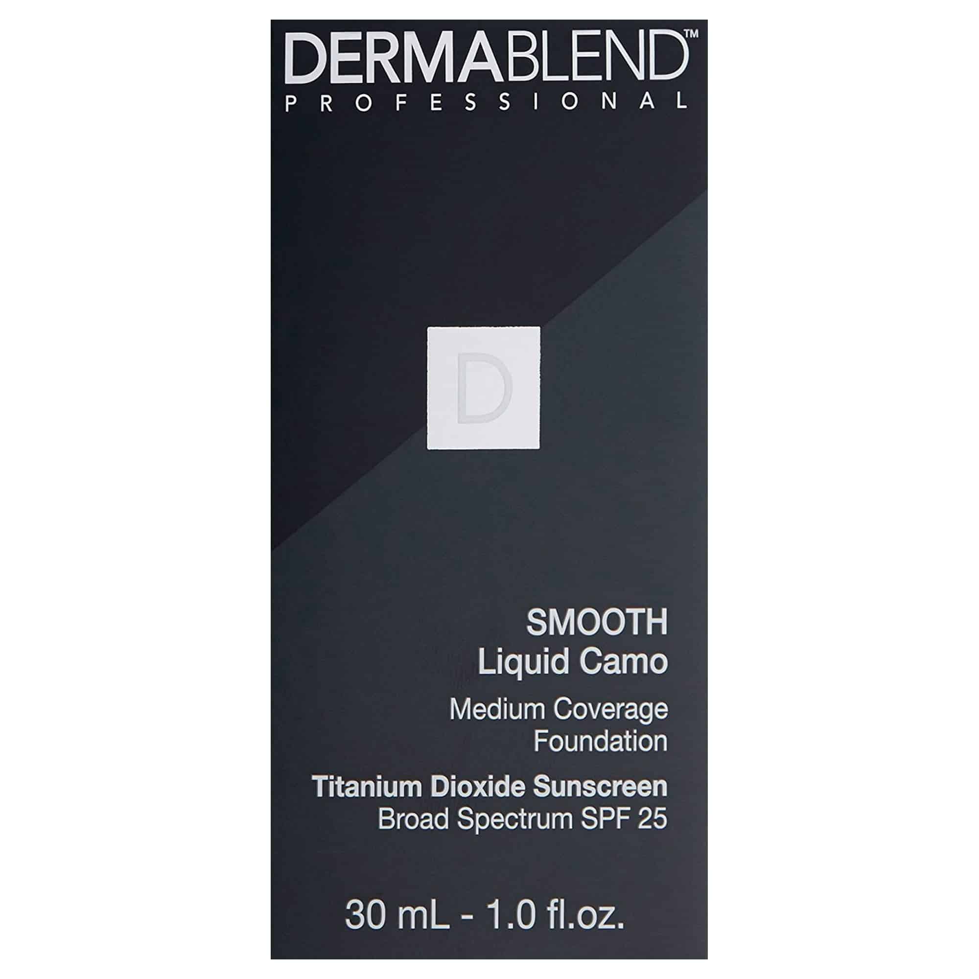 #1 Dermatologist Recommended Coverage Brand Dermablend brings you Smooth Liquid Camo Foundation, the ultimate hydrating, medium to full coverage foundation with broad spectrum SPF 25. This smoothing liquid foundation provides seamless, even coverage for up to 16 hours of consistent smudge and transfer resistant wear – when set with Dermablend Setting Powder. Cruelty-free. Formulated to suit normal to dry skin, it provides all-day hydration and broad-spectrum SPF 25 for flawless, comfortable coverage. This ulta-blendable liquid foundation contains concentrated high-performance pigments to cover skin concerns including dryness, blemishes, dark spots, uneven skintone, and redness. Product Benefits: ?Medium, buildable coverage with a natural finish ?Broad spectrum SPF 25 for easy sun protection ?All day hydration for healthy-looking skin SKIN SECURITY STANDARDS Dermatologist standards + #1 DERMATOLOGIST RECOMMENDED COVERAGE BRAND + NON-COMEDOGENIC + SENSITIVE SKIN-TESTED + ALLERGY TESTED Formula standards + CRUELTY-FREE + HIGH-PERFORMANCE PIGMENTS + FRAGRANCE-FREE + SLS-FREE + TRICLOSAN-FREE + PHTHALATE-FREE