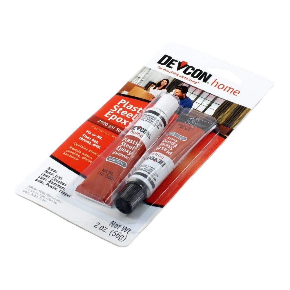 Devcon Plastic Steel Epoxy is a two-part, high strength, cold-welding epoxy for use on all types of metal repairs. Non-flammable and water-resistant, this epoxy contains a steel alloy that will not rust. Fills holes and repairs cracks in broken furniture, tools, appliances, toys, cars and more. Dries to a dark gray color, and once fully cured, it can be drilled, threaded, machined or filled. Bonds all metals including steel, stainless steel, aluminum, brass, iron, pewter, and copper with a tensile strength of 2500 PSI. Only mix the amount of hardener and resin together that can be used within the handling time, and always mix equal portions of the hardener and resin thoroughly together in order for this product to cure properly. Epoxies are generally not recommended for long term exposure to chemicals and solvents. Temperature Range: 200?F constant; 250?F intermittent.