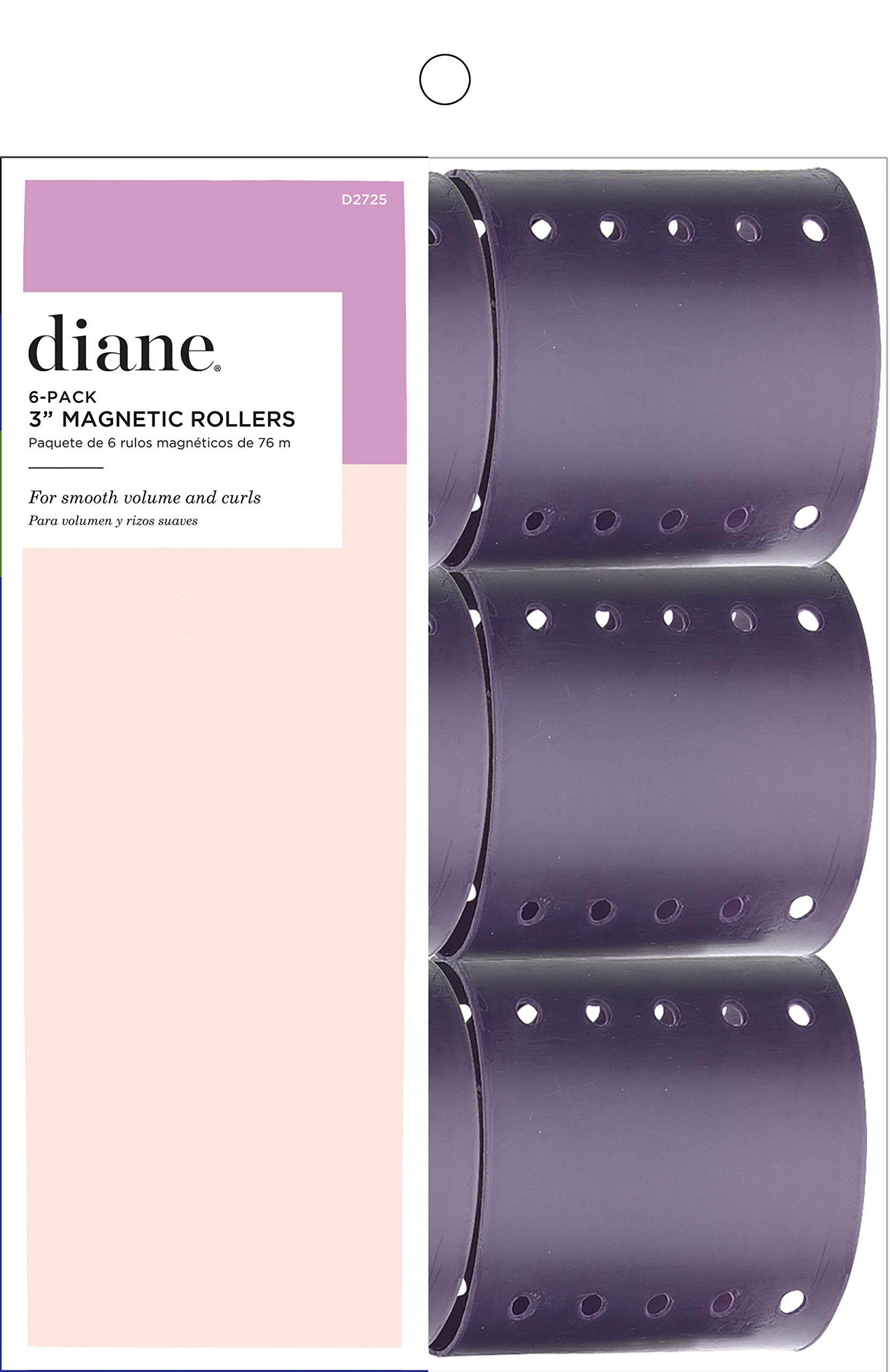 Diane Magnetic Rollers are best for professional use at a salon or for styling hair at home. These hair rollers are ideal for smooth volume, waves and curls. The curlers are sturdy and stay in place easily when secured with clips or pins. They are also vented to aid in fast hair drying. Each pack includes 6 large purple rollers measuring 3 inches in diameter. For all hair types.