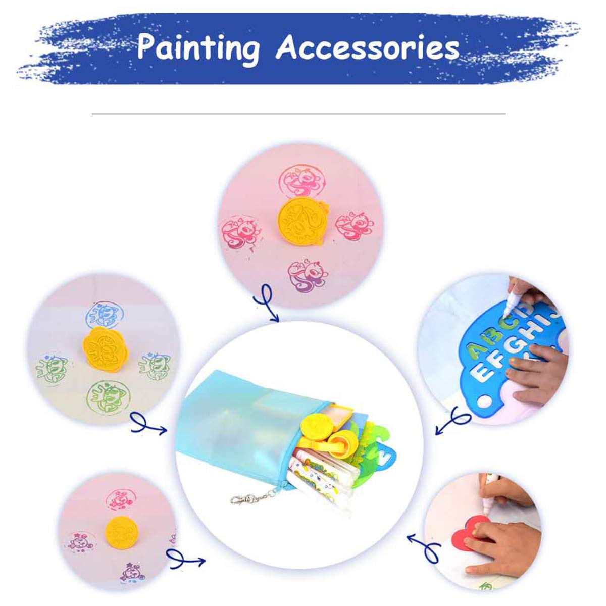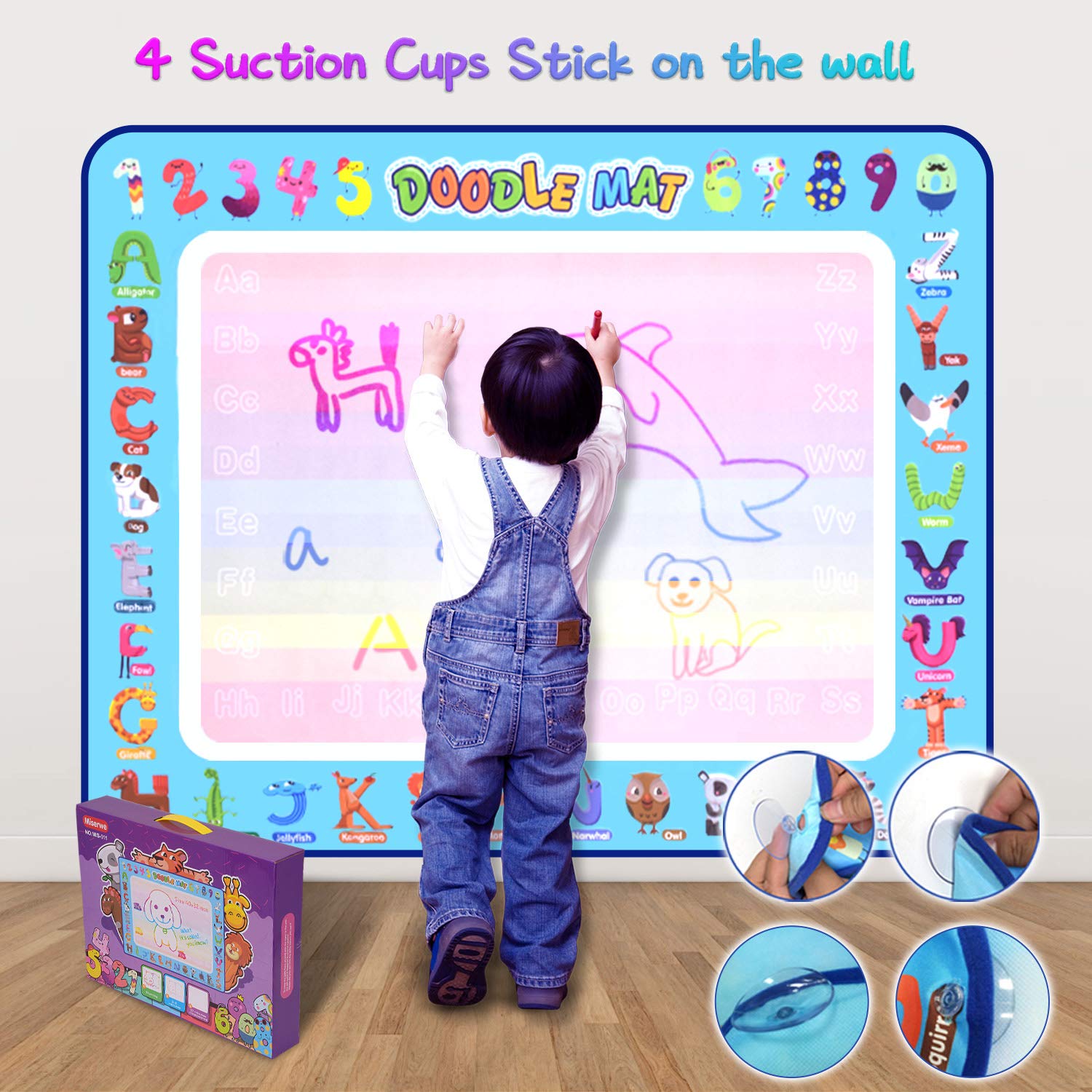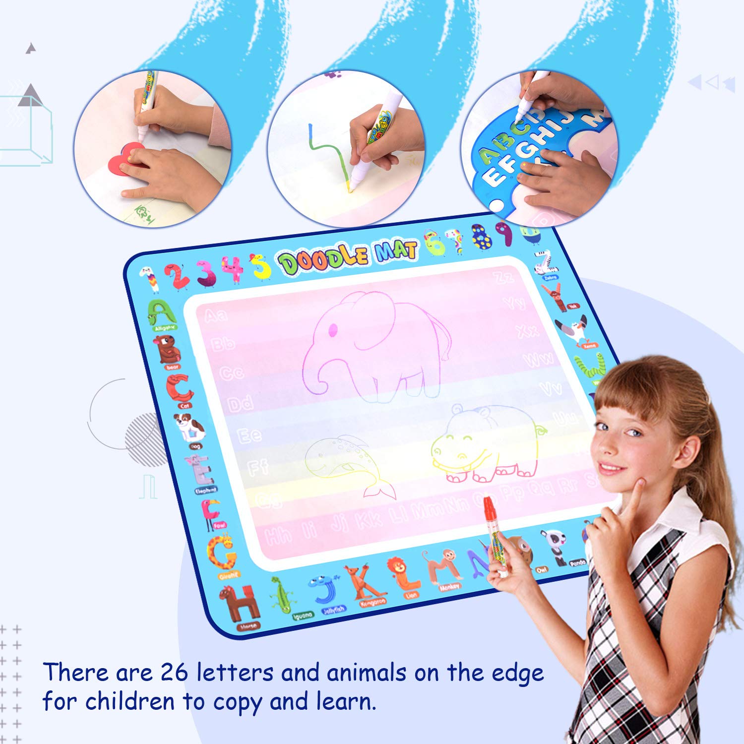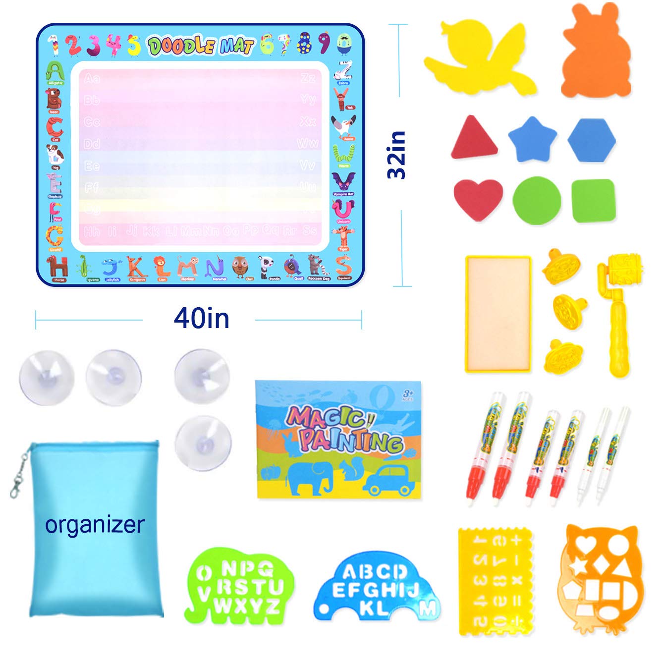 Size: 40x32inch Doodle MatA Colorful Toys:Water Doodle Mat is a colorful Toys. Just fill the water to doodle pen, child can draw on the mat with multicoloured lines and pattern. As the water dries, the drawings will fade away, and you can draw new pictures once again.This water doodle painting mat allows your child to paint with friends on the wall or floor, to exercise hand-eye coordination and color perception and develop painting and creative skills. The best choice for kids birthday or holiday.Our Doodle Mat is a 40x32inch Large Size mat which can be folded into a compact size. The water will be disappear automatically in 10mins, Light and save storage space portable for indoor, outdoor and travel. Suitable for children to learn toys.A good interactive toy for boys and girls.Multiple Drawing Kit include a Doodle mat, four Silicone Sucker, six Water Pens, eight Drawing Molds, four Drawing Template, three Animal Stamps, a Roller Stamps, a Water dish, a Drawing Booklet, a Pen Bag.The back of the mat is nylon material, clean and safety for kids. No ink, No paint, No toxic, No polluting. Never make a mess.Products Overview:Material: Water-resistant Nylon, PolyesterUse Guide:1.soak the pen head in warm water for minutes to swell it2.unscrew the pen and add water inside3.start your doodle creativity freelyNote: The doodle may need 5-10 minutes to disappearCare:Only written with waterNo machine washKeep away from the heat