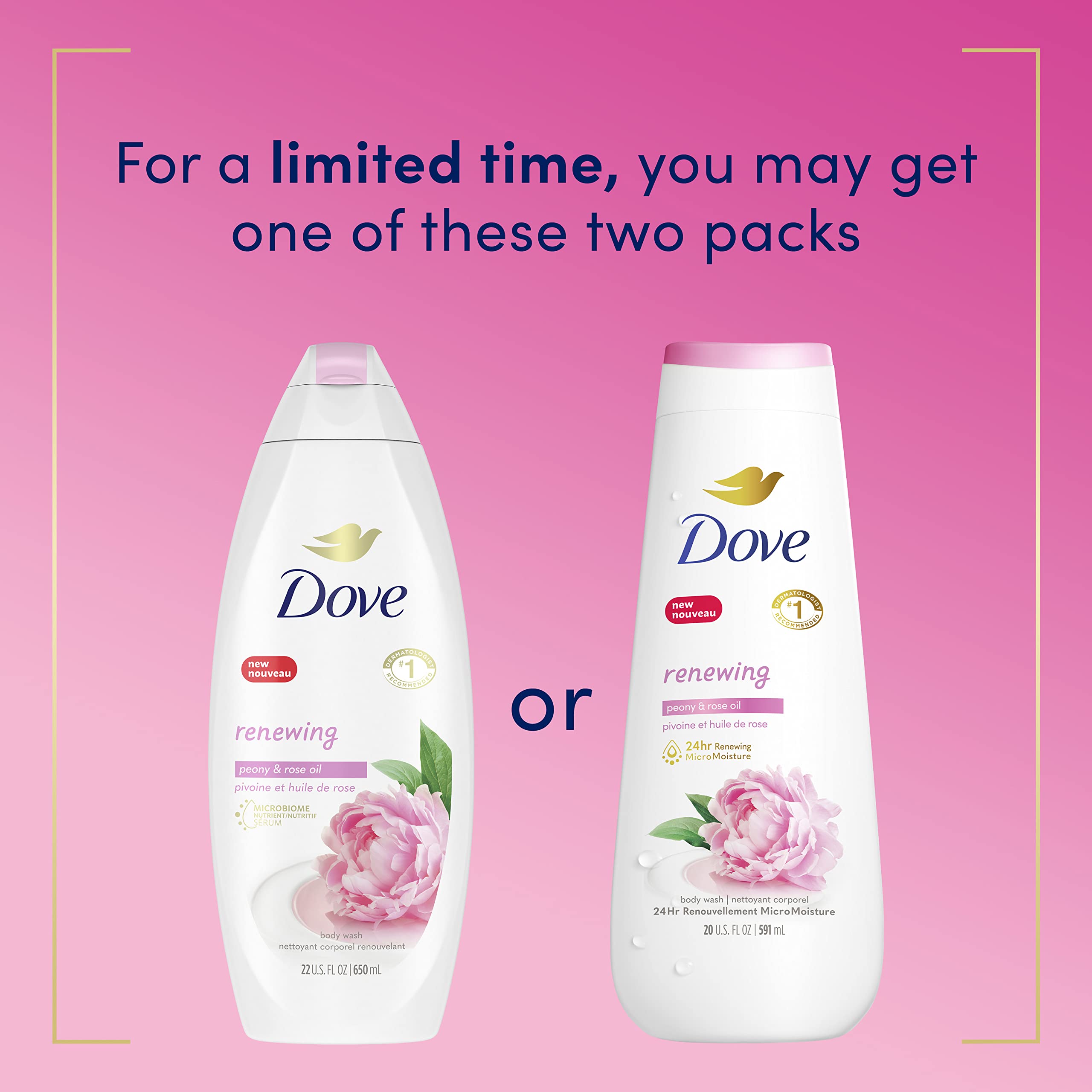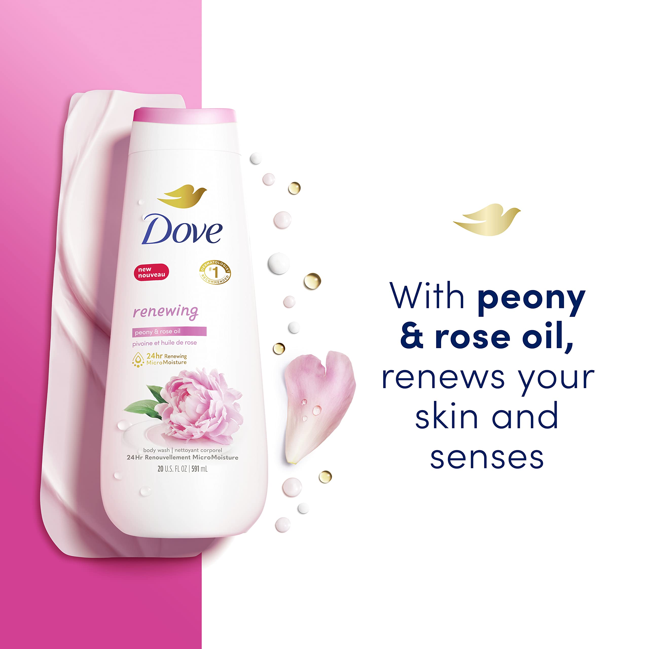 - 24HR RENEWING MICROMOISTURE: Dove Renewing Peony and Rose Oil Body Wash gently cleanses and nourishes the skin, leaving it renewed and healthy-looking for 24 hours