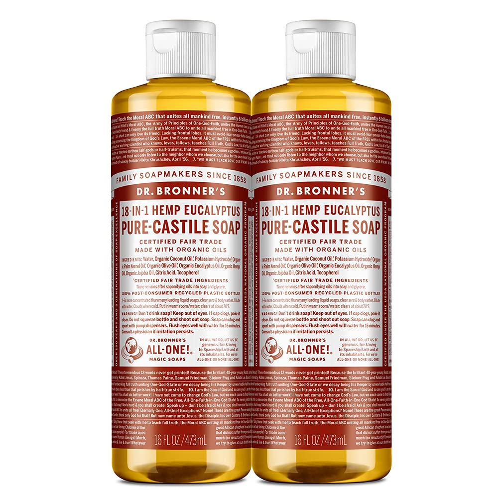 Dr. Bronner’s – Pure-Castile Liquid Soap (Eucalyptus, 16 ounce, 2-Pack) – Made with Organic Oils, 18-in-1 Uses: Face, Body, Hair, Laundry, Pets and Dishes, Concentrated, Vegan, Non-GMO