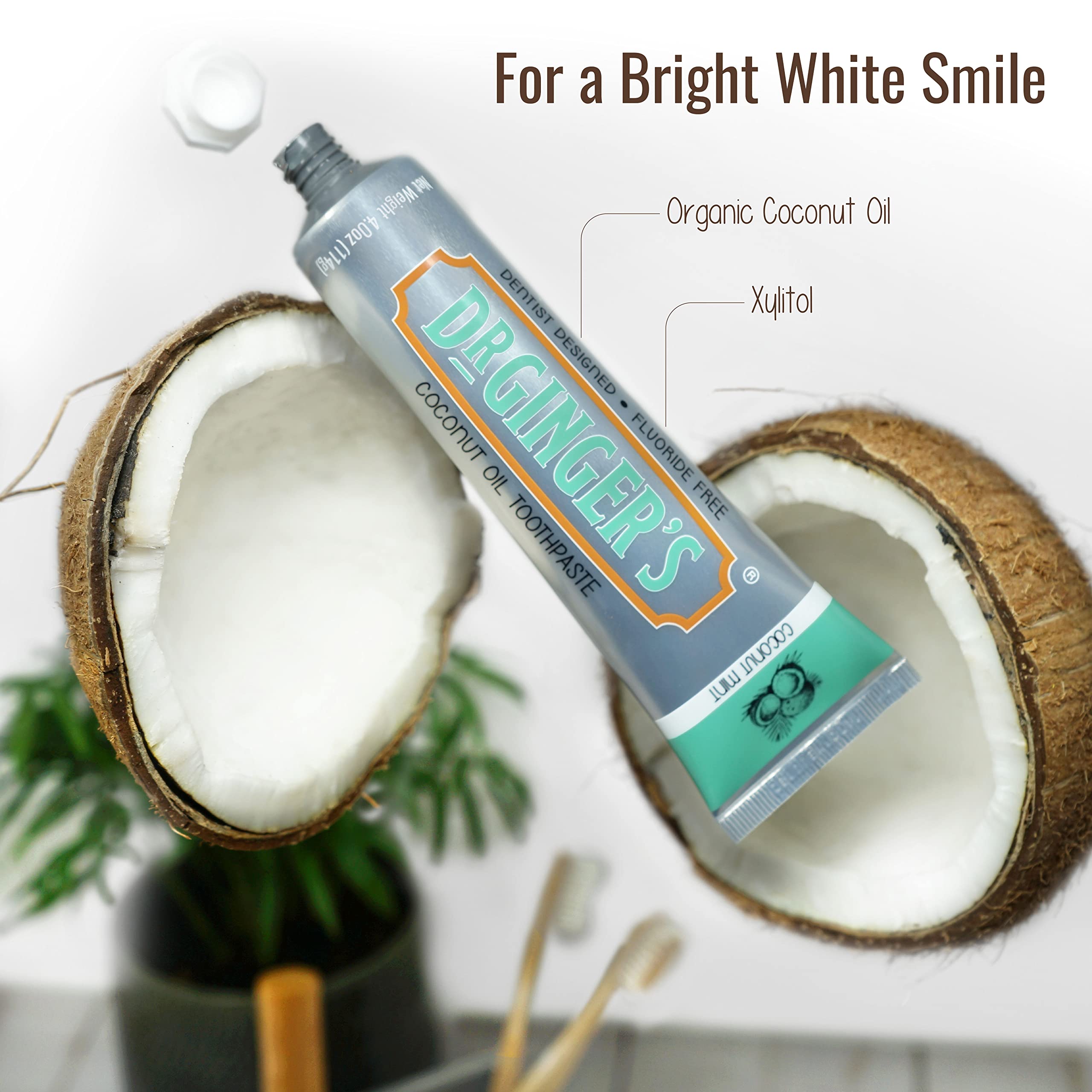 - DR. GINGER’S COCONUT OIL TOOTHPASTE A premium one of a kind toothpaste, made with organic Coconut Oil and Xylitol that tackles oral care in whole new way; it coats the teeth in a luxuriously smooth layer that protects gums, repels bad breath and whitens teeth. No unnecessary ingredients, or over-done tastes. Packaging includes a 4oz tube, 1ct
