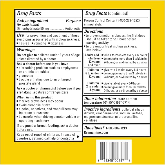 Get powerful, fast, relief from motion sickness when you need it most from the number 1 pharmacist-recommended brand!* Dramamine Motion Sickness Original tablets prevent and relieve nausea, dizziness and vomiting. Dramamine is a vacation essential in your travel medicine bag. Don’t let motion sickness affect your plans on your next cruise, theme park visit or road trip. If you know you are going on an adventure that is likely to cause motion sickness and nausea, take Dramamine Original BEFORE the trek. Also, be sure to drink plenty of water and avoid alcohol, which can increase dehydration and nausea. Take Dramamine and Take Control. For adults and children 6 and older. See packaging for dosing instructions and warnings. *Named by Pharmacy Times and U.S. News & World Report as #1 Pharmacist-Recommended Brand for 2022 Motion Sickness Remedies Category.