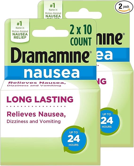 Get fast relief from everyday causes of nausea from the number 1 name in motion-related nausea relief!** Dramamine Nausea Long Lasting relieves nausea, dizziness and vomiting for up to 24 hours. Car rides, commuting, gaming and some TV programs and films are all things that can cause nausea. And, Dramamine Long Lasting is specially formulated for long-lasting relief from multiple causes of nausea. If you are feeling nauseated, try Dramamine Long Lasting along with these tips to help ease nausea: 1) Step outdoors or open a window and get a breath of fresh, cool air. 2) Try warm foods like soup or broth that feel soothing on the tummy. 3) Keeping hydrated can help to minimize the feeling of nausea. 4) Take small, frequent sips of clear liquids or an electrolyte-containing beverage. For adults and children 12 and older. See packaging for dosing instructions and warnings. *These statements have not been evaluated by the Food and Drug Administration. This product is not intended to diagnose, treat, cure or prevent any disease based on practices of traditional medicine. **Named by Pharmacy Times and U.S. News & World Report as number 1 Pharmacist-Recommended Brand for 2022 Motion Sickness Remedies Category.