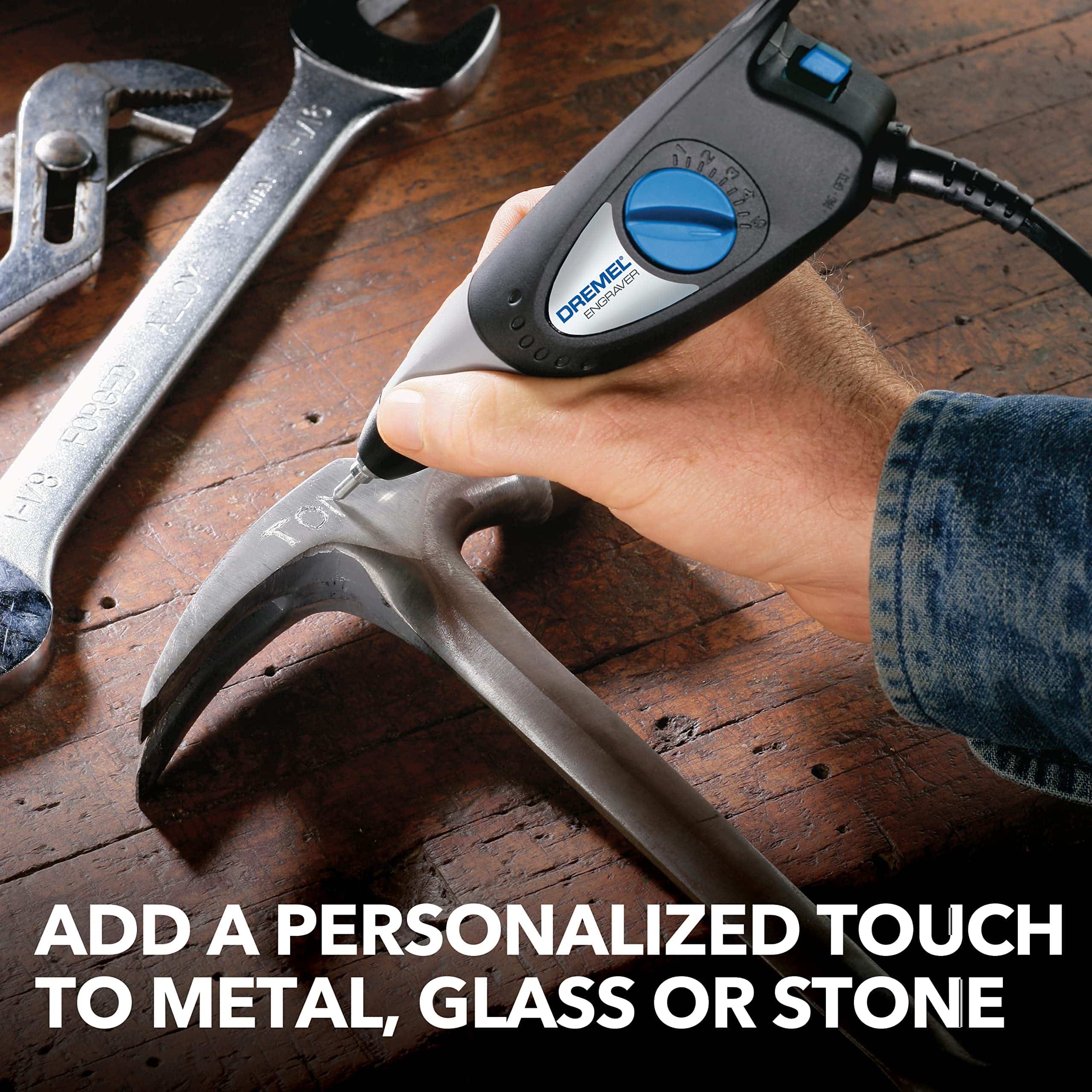 Make your mark with engraving. Using an engraver is a great way to personalize all kinds of things by adding a distinctive touch to everyday items or to carry out fun crafts projects. Get an arts and crafts engraving tool kit that does it all. This unique craft tool kit lets you engrave or decorate a wide variety of materials, including metal, plastic, glass, ceramic, wood and leather. Each Dremel engraver kit includes a tool with a soft-grip body and variable stroke control so you can etch both fine lines and deep grooves. Also included is a replaceable carbide engraving point. The Engraver makes an amazing gift for the arts and crafts enthusiasts in your life. By providing you with options that a stand-alone leather, wood or metal engraving kit can’t; Dremel gives you more ways to personalize your valuables. Includes a letter & number stencil template for easy engraving. Backed by a two year limited warranty.