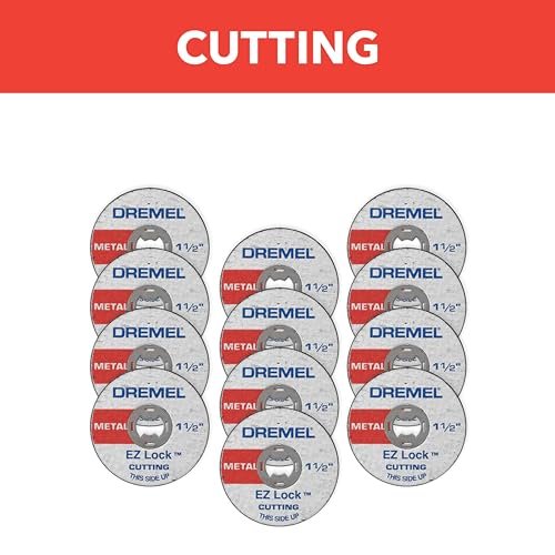 Turn your Dremel rotary tool into a powerful cutting machine with EZ Lock? Fiberglass Reinforced Cut-Off Wheels. The EZ456B includes 12 fiberglass reinforced cut-off wheels designed to last 2X longer compared to the 426. The highly-durable cut-off wheels feature a 1-1/2 In. (38.1 mm) wheel diameter and 0.045 In. (1.1mm) thick blade making it ideal to cut, groove, and trim all types of metal including hardened steel. Perfect for projects like cutting bolt heads, reslotting damaged screws, cutting sheet metal, or trimming metal rods. The cutting discs are also ideal for delicate woodworking projects and can be used on other materials including wood, plastics or ceramics. The wheels are designed with the patented EZ Lock? system making accessory changes quick and easy. For use with the EZ402 EZ Lock mandrel only.