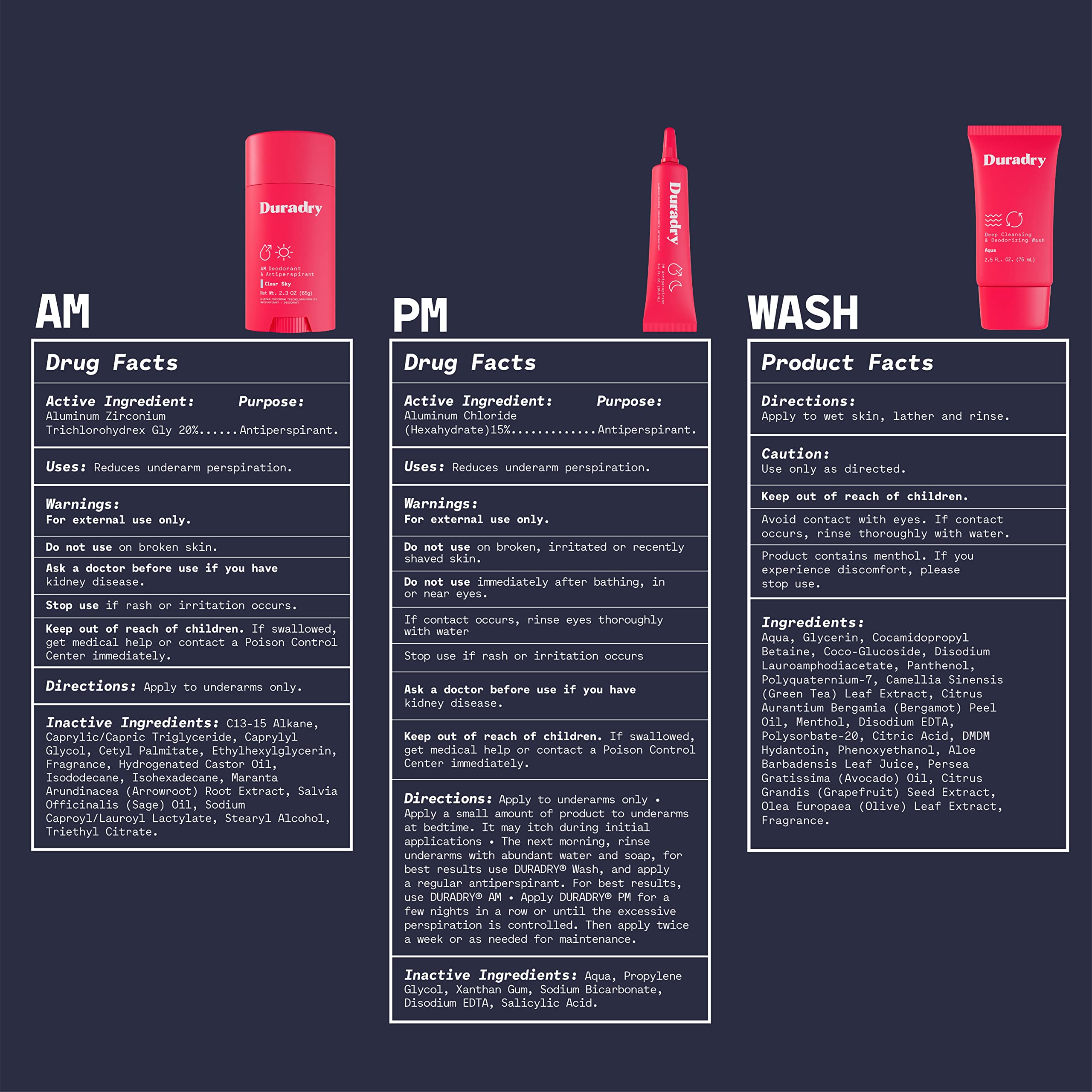 - Recommended by Dermatologists – Duradry Wash, Duradry AM and Duradry PM hyperhidrosis deodorants are endorsed by dermatologists as effective excessive sweating treatment. Use daily to experience best results. Packaging might be different than the listing photos