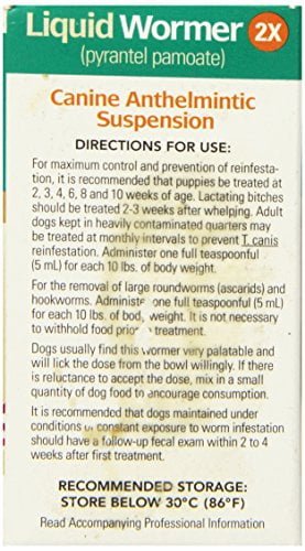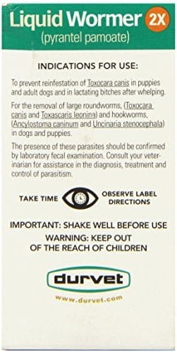 Double strength liquid wormer that effectively removes large roundworms and hookworms from puppies, adult dogs and lactating dogs. Safe to use on puppies as young as two weeks.