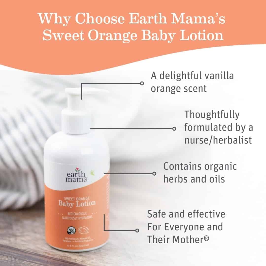 - MOISTURIZING AND SOOTHING SWEET ORANGE CALENDULA LOTION: Earth Mama?s Sweet Orange Baby Lotion is a smooth, moisturizing vanilla-orange blend, rich with organic oils, calendula and rooibos to comfort and soothe delicate skin.