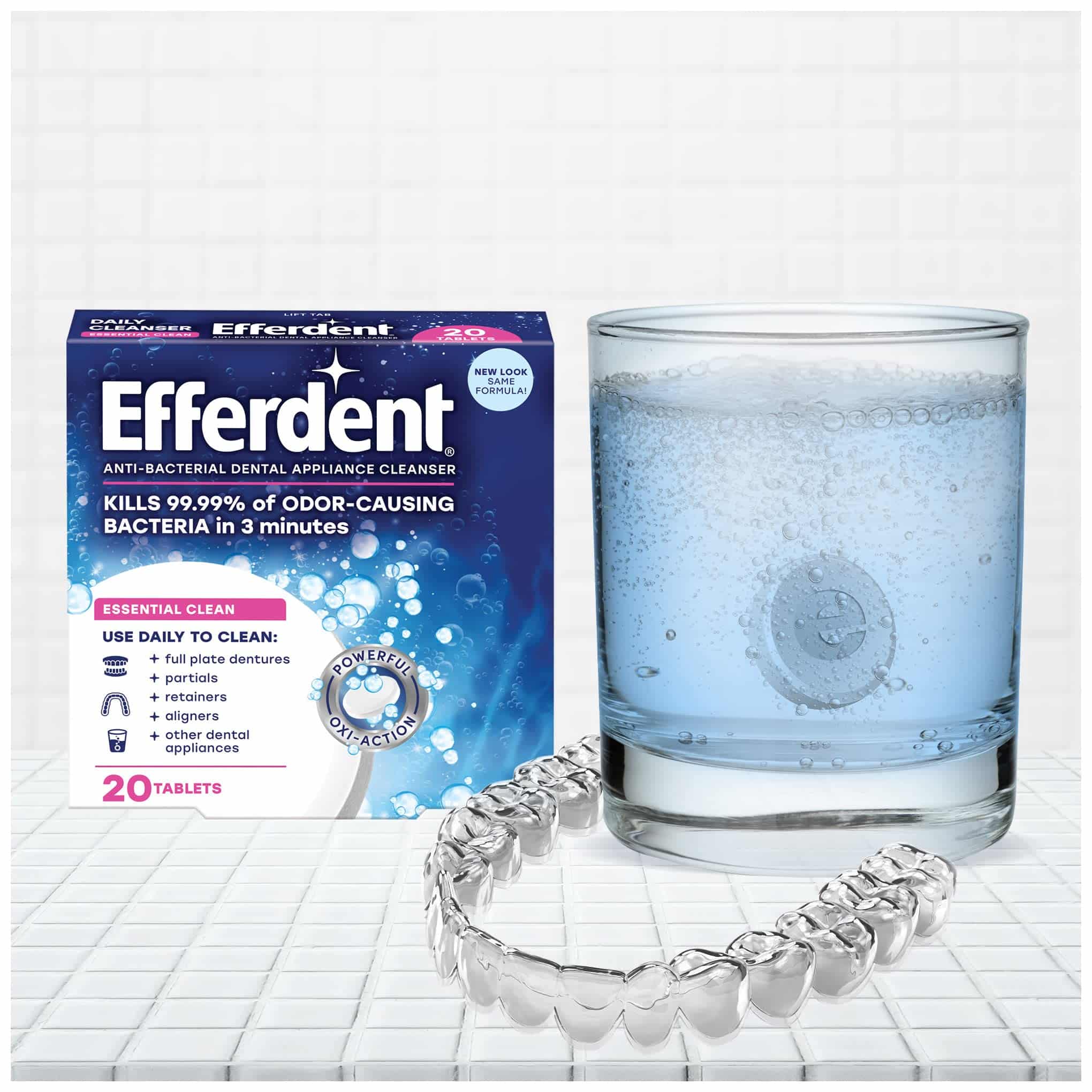 - Efferdent Essential Clean antibacterial cleaner tablets provide an everyday, odor-free clean