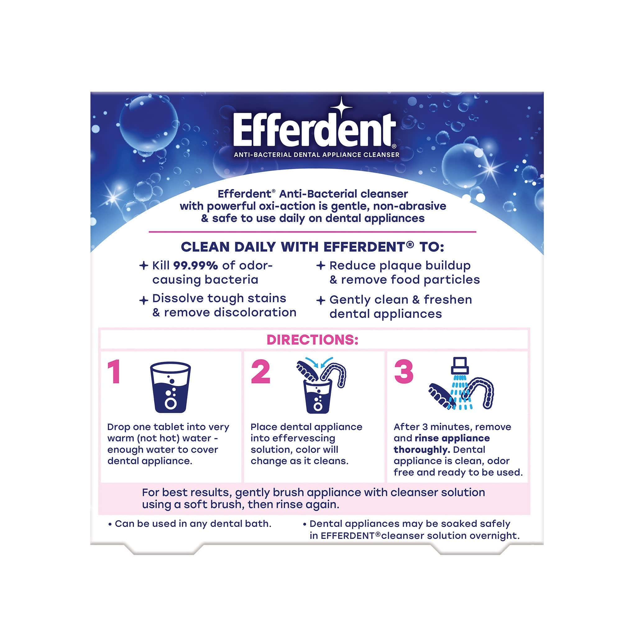- Use Efferdent retainer cleaner tablets daily to clean retainers, full-plate dentures, partials, aligners and other dental appliances