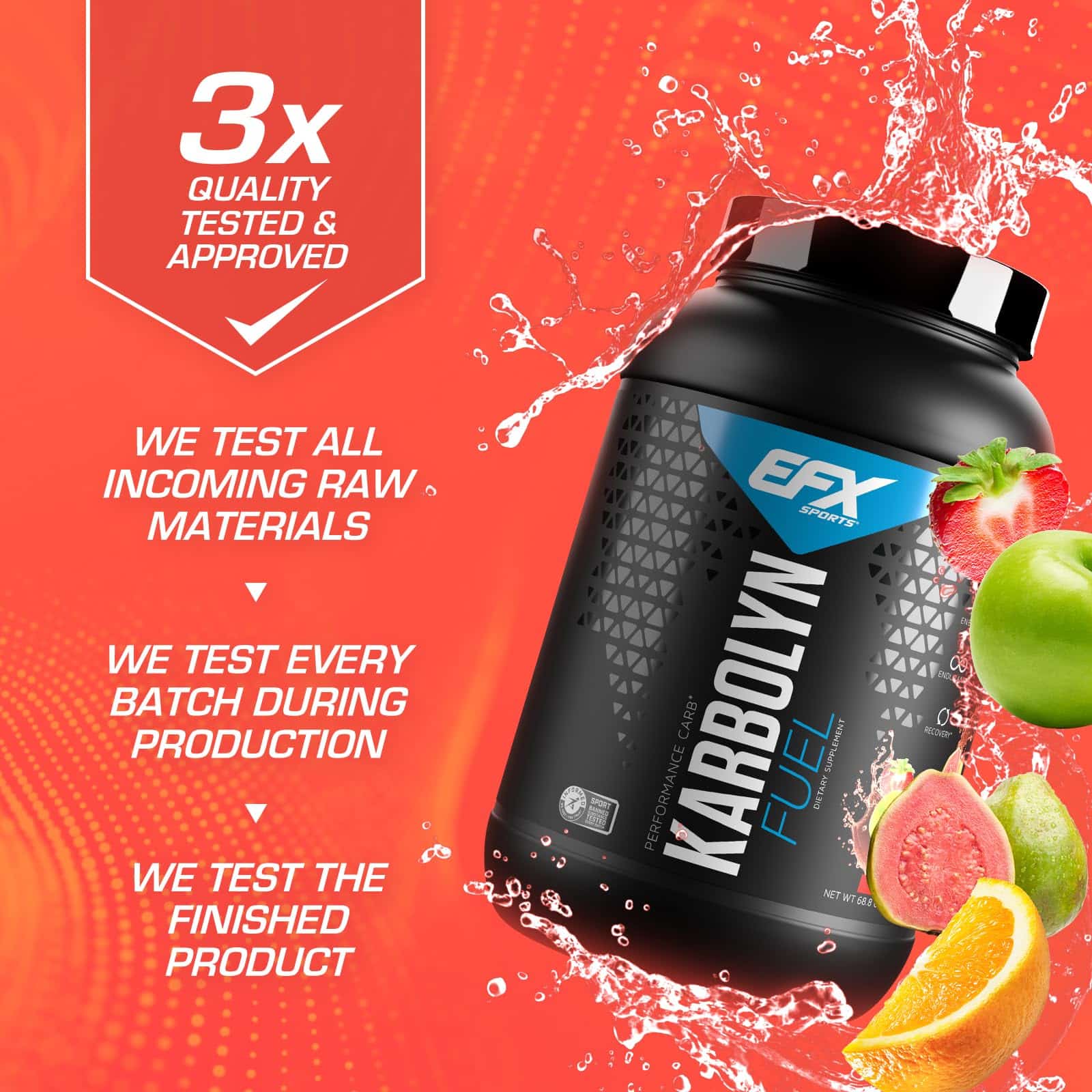 - 3X QUALITY TESTING: At EFX Sports, we proudly own every phase of the manufacturing process to ensure what’s on the label is what’s in the bottle…without question. In fact, every EFX Sports product must pass 3 critical quality checkpoints?before, during and after production.