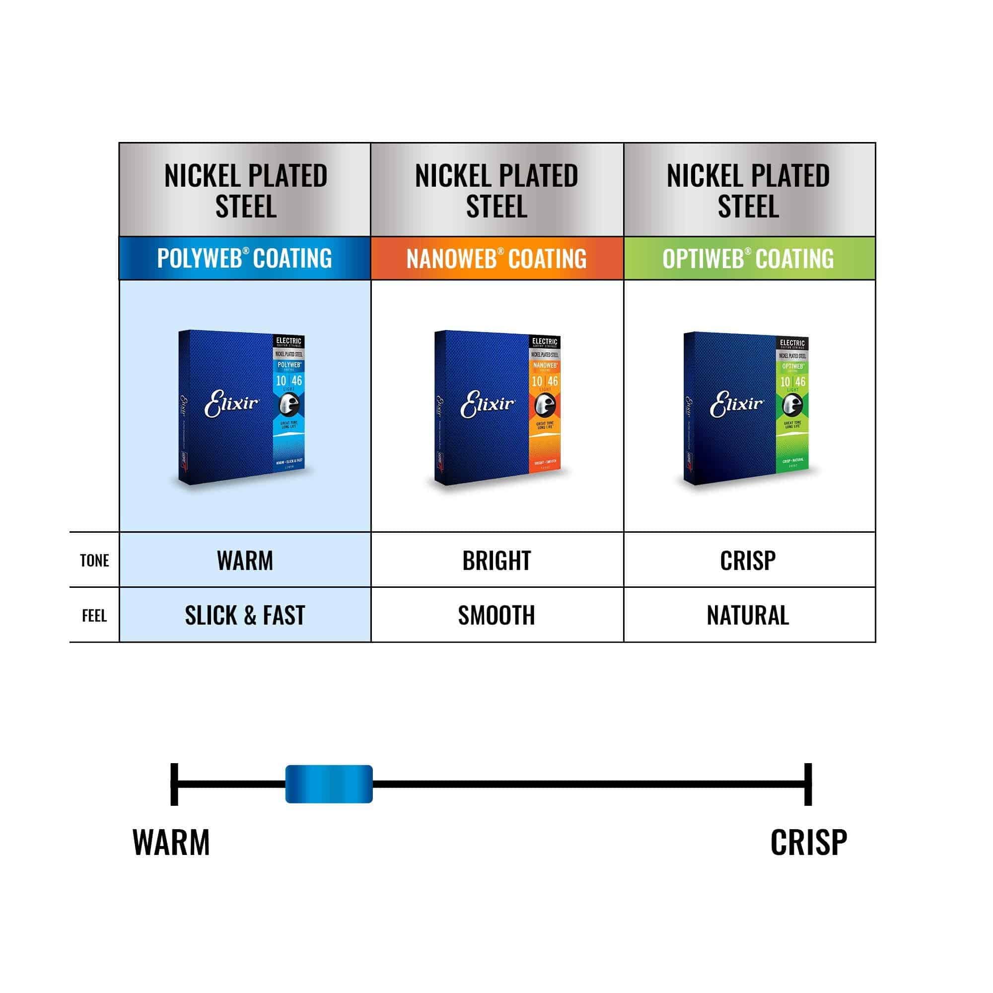 - CONTENTS: 1x Single Pack of Elixir Electric Guitar Strings, Nickel Plated Steel with POLYWEB Coating, Longest-Lasting Warm Tone with Comfortable Feel, 6 String Set, Super Light 9-11-16-24-32-42