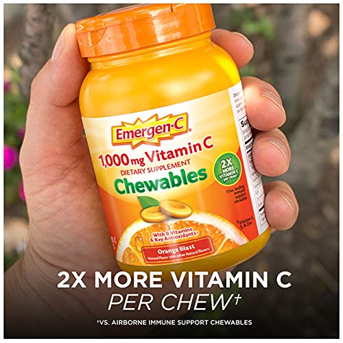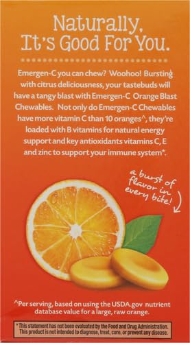 Emergen-C Immune+ Chewables are a quick and tasty way to help support your immune system as part of your daily wellness routine.* Just two Emergen-C chewable tablets deliver 1,000 mg of Vitamin C ? more than 10 oranges . That?s two times more Vitamin C per chew than the leading immune support chewable . Emergen-C chewables also provide Vitamin D, plus Vitamin E, Vitamin B6 and Zinc for additional immune system support.* Emergen-C Chewables will give taste buds a tangy burst of goodness with natural, real fruit flavor ? no water needed! Emergen-C Immune+ Orange Blast chewable makes it deliciously easy to support wellness goals. Transform every day with the support of Emergen-C. Based on using the USDA.gov nutrient database value for a large, raw orange Per chewable tablet. Compared to leading immune support chewable *These statements have not been evaluated by the Food and Drug Administration. This product is not intended to diagnose, treat, cure, or prevent any disease.
