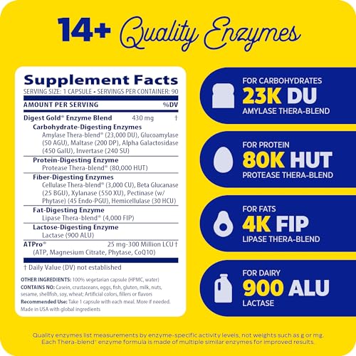 Enzymedica Digest Gold + ATPro, Maximum Strength Digestive Enzymes, Helps Digest Large Meals for Instant Bloating Relief, 90 Count