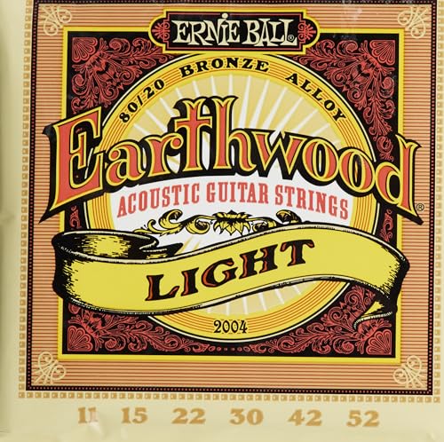 Ernie Ball Earthwood 80/20 Bronze acoustic guitar strings are made from 80% copper, 20% zinc wire wrapped around hex-shaped, brass-plated steel core wire. These acoustic guitar strings produce a bright, balanced sound with pleasing overtones. Gauges .011, .015, .022w, .030, .042, .052.