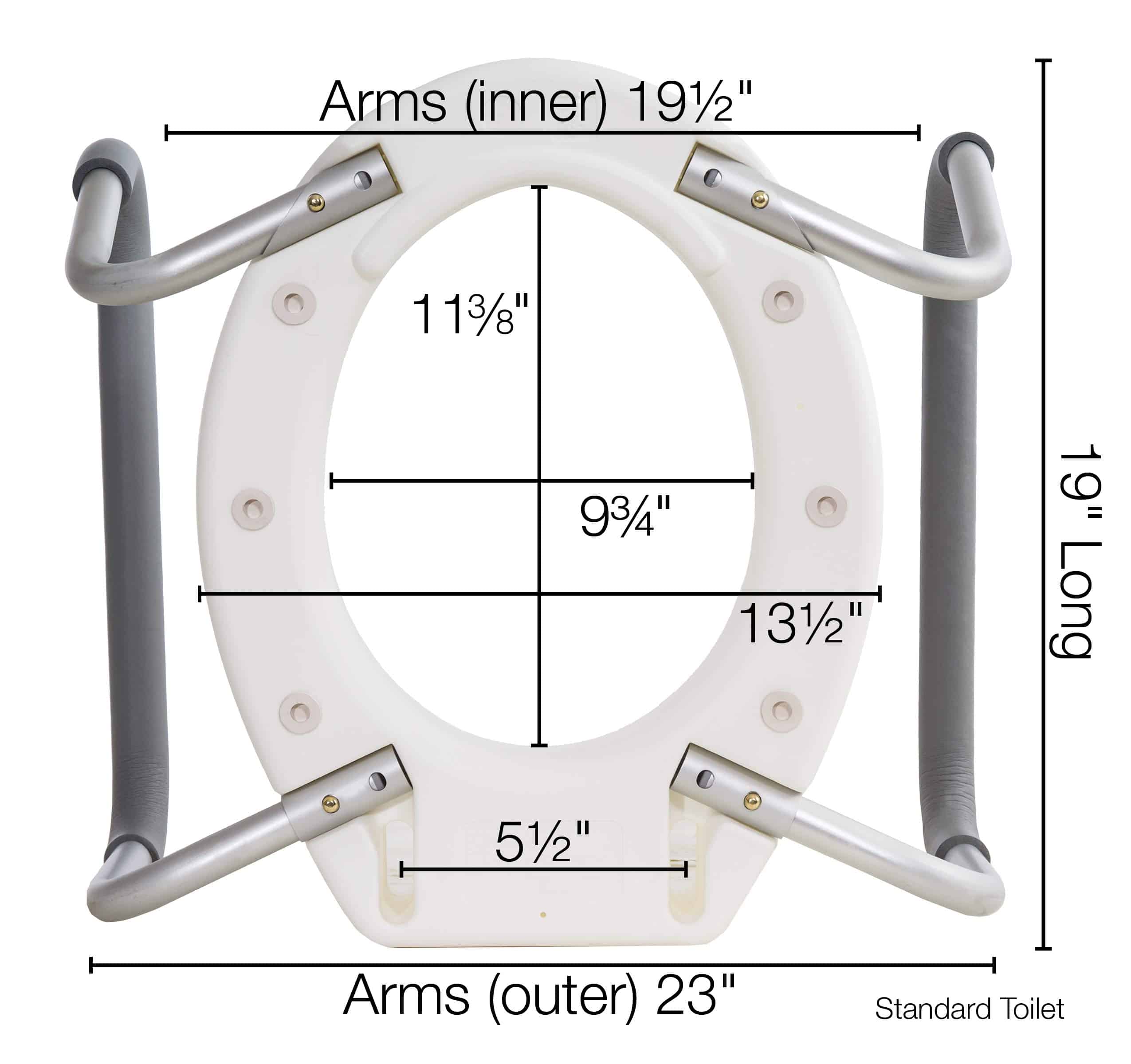 The Standard Round Elevated Toilet Riser with Arms gives the elderly, seniors and anyone who needs it the elevation of a toilet riser while allowing them the comfort of their exisitng seat. Padded, removable arms make it more secure when getting on or off the toilet. The Toilet Riser aligns exactly with your existing bowl to provide extra security versus toilet seats that sit on or don’t bolt to the seat while also providing for a larger opening for better hygiene. The Toilet Riser can be easily installed securely under your existing toilet seat using the included long screws and bolts. Toilet Risers are also available in an elongated size so please check the size of your toilet bowl before purchasing. Standard Seat Depth: 17.5″ Overall Width with Arms: 19.25″ Riser Height: 3.5″ Tools required for installation.