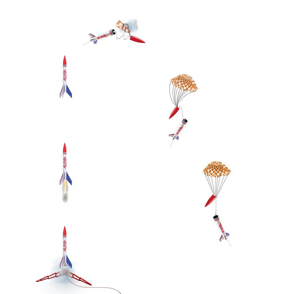 The Alpha requires an Estes Launch System and Estes engines for the launch (not included). ? A6-2, A8-3, A8-5, B4-4, B6-4, B6-6. C6-5 or C6-7 engines suggested for all missions. Unless otherwise specified, all models require assembly. Tools, construction and finishing supplies sold separately. In order to launch, a launch system, model rocket engines, igniters, recovery wadding and four ‘AA’ alkaline batteries are required ? sold separately unless otherwise specified. Read all instructions before beginning. Make sure you have all parts and supplies required. Test fit all parts before applying glue. Sand as necessary for precision assembly. Product color and shape may vary. When launching, stand back as far as the launch controller cord will allow (15 feet). Rocketry is not intended for indoor use. Choose a large field (500 feet), free of dry weeds and brown grass. Launch only with little or no wind and good visibility.