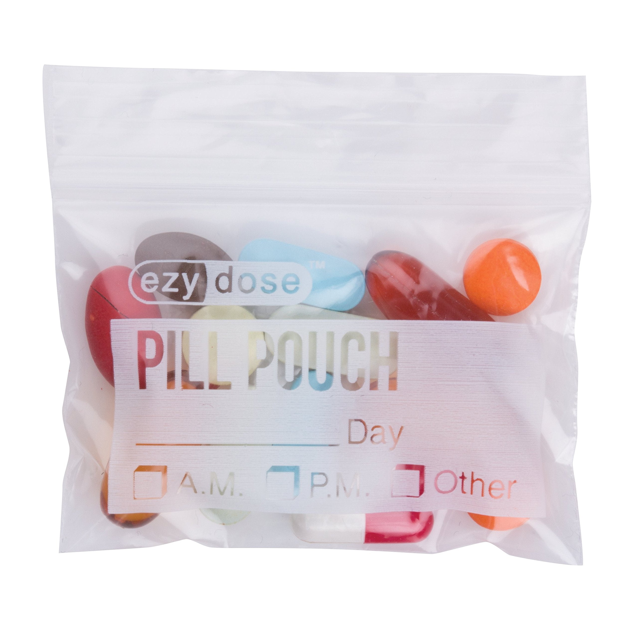 Ezy Dose Disposable Pill Pouches (50 count) These zipper-seal pill pouches are made of clear, polyethylene and are perfect for medication storage and travel. The pouches have a write-on labeling block for easy labeling. Main features: Large Capacity – Each bag can hold up to 80 Aspirin. Perfect For Travel. Write-On Labeling Block – White labeling block for easy labeling. Ezy Dose is the leader in easy-to-use medication management products. Many of our push-button pill planners are endorsed by the Arthritis Foundation for our ease-of-use design. Ezy Dose products make living healthier simply easier with products like pill cutters, pill crushers and a full line of easy-fill planners.