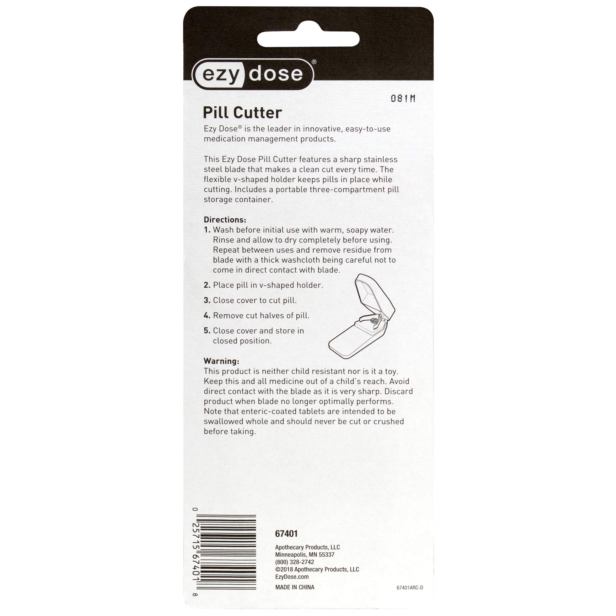 Ezy Dose Pill Cutter and Daily Dose – Pill Cutter. This Pill Splitter is Simple To Use and Easily Cuts Through Tablets and Pills. The product includes a daily dose pill planner to hold all of your days medication. The tablet splitter’s stainless steel blade effortlessly cuts through pills and tablets The main features of the Pill Cutter & Daily Dose Planner include: Compact Design – The Tablet Splitter’s compact design allows for discrete storage and easy transportation, Stainless Steel Blade – Stainless steel blade is durable and easily cuts through pills and tablets, Simple Cutting Action – Cuts and Splits medication efficiently with only light pressure applied by the user, Daily Dose Planner – Pocket sized pill planner has 3 compartments to hold your day’s medication. About Ezy Dose: Ezy Dose is the leader in easy-to-use medication management products. Many of our push-button pill planners are endorsed by the Arthritis Foundation for our ease-of-use design. Ezy Dose products make living healthier simply easier with products like pill cutters, pill crushers and a full line of easy-fill planners.