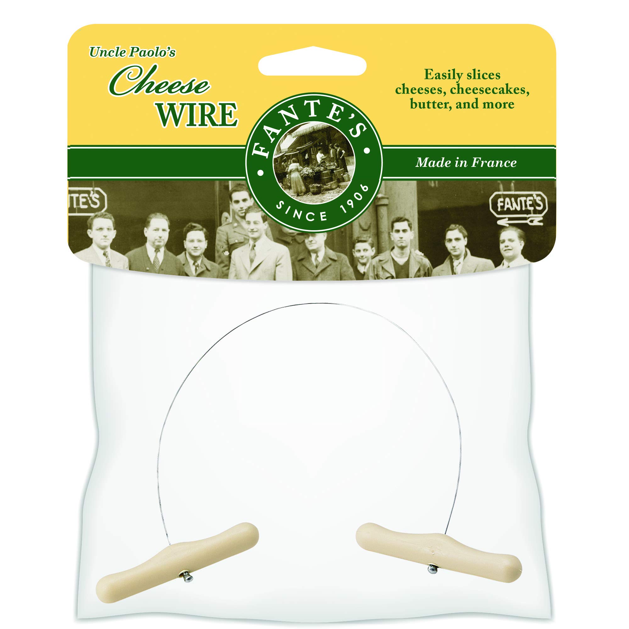 Fantes Uncle Paolo s Cheese Wire easily cuts through all types of firm cheeses and allows each slice to be cut to desired thickness. Cheeses are tastiest when sliced immediately before use. Uncle Paolo s Cheese Wire makes slicing cheese quick and easy. No more pre-cut slices with dried or hardened corners. From cheddar, mozzarella, Parmesan, and other firm cheeses, to sticks or blocks of cold, hard butter, its fine-gauge stainless steel cutting wire glides through and slices effortlessly without straining hands or wrists. Perfect for people with arthritis and carpal tunnel. The simple design allows complete control over the thickness of each slice, making it the perfect adjustable cheese slicer. It doubles nicely for portioning soft, creamy cheesecake, which can be tricky to slice, and cutting batter-based cakes into layers. This useful addition to kitchen gadgets, cooking tools, and cake decorating supplies is easy to use. Simply stretch the handles apart until the wire is taut. Lay the wire across the cheese or other food to be sliced. Use a consistent firm pressure and pull downward. Made in France from stainless steel and sturdy ABS handles, Fante s Uncle Paolo s Cheese Wire is sturdy, durable, and resists rust. Hand wash in warm, soapy water. Dry thoroughly before storing. Fante s, The Italian Market Original since 1906. Brought to you by HIC Harold Import Co.