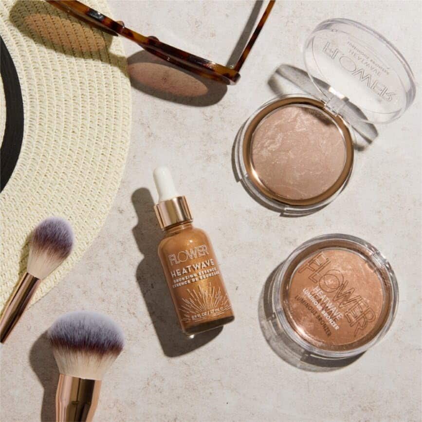 - FLOWER Beauty’s Heatwave Luminous Bronzer has a marbleized color that blends effortlessly for warm, sun kissed skin with a luminous finish.