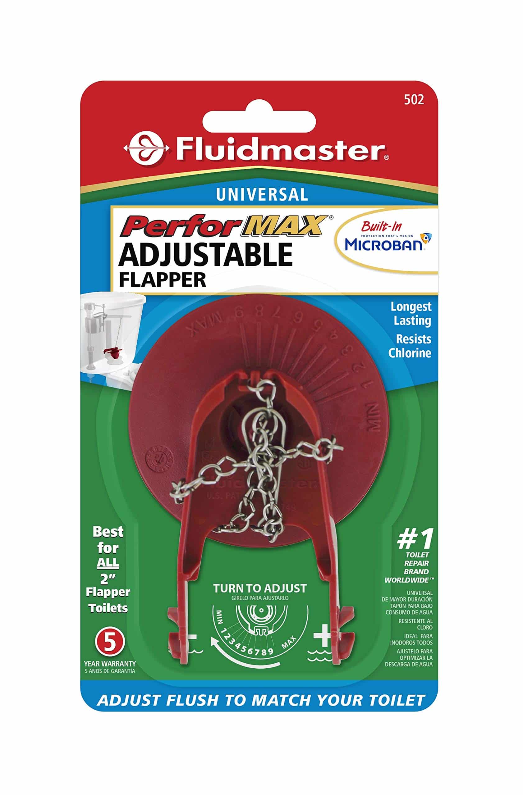Save on water, money, and time with the Fluidmaster 502P21 PerforMAX Universal Water-Saving Toilet Flapper, a top choice for flush efficiency and solving common running toilet problems. The PerforMAX water saving adjustable dial design optimizes your flush performance and water use. Built durable for a long life, this flapper is constructed with corrosive resistant Microban materials and a solid frame that won?t bend for a secure seal. A universal design that fits most 2-inch flush valve models, it?s best used with high efficiency 1.28 and 1.6 gallons per flush toilets and can work with 3.5 gallons per flush toilets. This highly efficient design also features simple and easy installation, saving on DIY toilet repair time and costs. The Fluidmaster 502P21 PerforMAX Universal Water-Saving Toilet Flapper comes with a 5-year warranty.