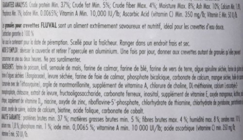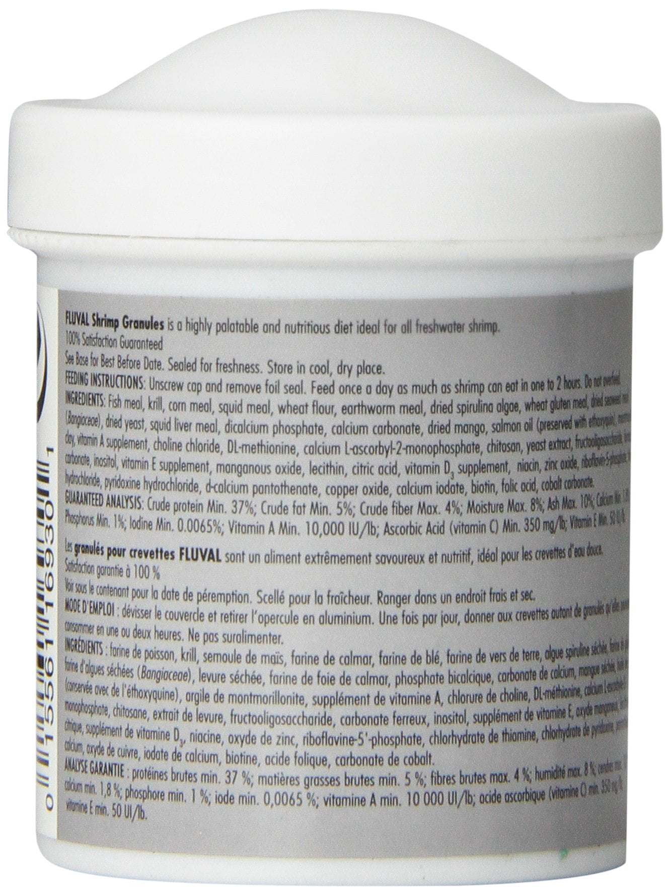 Fluval Shrimp Granules Food is a highly palatable food that provides a rich source of nutrients and proteins. This formula contains a natural source of iodine which is known to aid shrimp during the molting process. Fluval Shrimp Granules Food also contains Advanced Yeast Extract inclusion, to provide the proven benefits of pre-biotics, improved disease resistance and improved digestion for optimal nutrient absorption. The Fluval Shrimp Granules Food was made for freshwater shrimp.