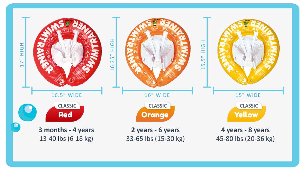 - THE FREDS 3-STAGE SWIM SYSTEM: Our SWIMTRAINER ?Classic? is available in 3 sizes creating the perfect learning device for young swimmers. Stage 1: RED – designed for beginners aged 3 months to 4 years to help them get used to the water. Stage 2: ORANGE – designed for beginners and advanced swimmers aged 2 to 6 years old to learn further coordinated arm and leg movement. Stage 3: YELLOW – designed for advanced swimmers aged 4 to 8 years old to support their transition to free swimming.