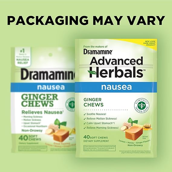 Get fast relief from multiple causes of nausea with Advanced Herbals motion-related nausea relief from the makers of Dramamine! Advanced Herbals Nausea Ginger Chews are a dietary supplement that helps relieve nausea from morning sickness, upset stomach* and occasional heartburn.** Advanced Herbals Ginger Chews contain a clinically tested dose of ginger*providing non-drowsy relief in a convenient soft chew.* These Ginger Chews come in a great-tasting lemon-honey-ginger flavor and are safe for frequent use since they are made with natural ginger extract.^ Take a dose of 2 Ginger Chews for great tasting nausea relief. They are individually wrapped and are a must have for your travel essentials. Adults and children 6 years and older take 2 chews, up to 4 per day. For pregnancy nausea relief or morning sickness relief, pregnant women take 2 chews twice daily as needed; up to 4 per day. Ditch the Drama with non-medicated relief! *Based on practices of traditional medicine. **These statements have not been evaluated by the Food & Drug Administration. This product is not intended to diagnose, treat, cure or prevent any disease based on practices of traditional medicine. ^Extract equivalent to clinically tested dose of powdered ginger for morning and motion sickness.