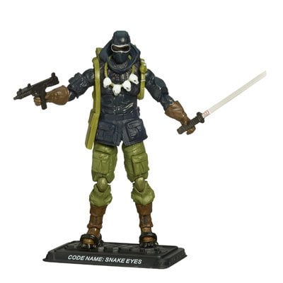SNAKE EYES is proficient in 12 different unarmed fighting systems (Karate, Kung-Fu, Jujitsu) and is highly skilled in the use of edged weapons. He has received extensive training in mountaineering, underwater demolitions, jungle, desert and arctic survival, and holistic medicine. He?s a qualified expert in all NATO and Warsaw Pact small arms. His expertise with arctic conditions came in handy when a team was sent to find out what happened to an Arctic research station. His ingenuity helped the team survive several encounters with the wily yet honorable Eskimo operative Kwinn and recover a fear-generating frequency modulator. Ready for combat complete with weapons and accessories, this 25th anniversary action figure is ready to stand tall in your collection!