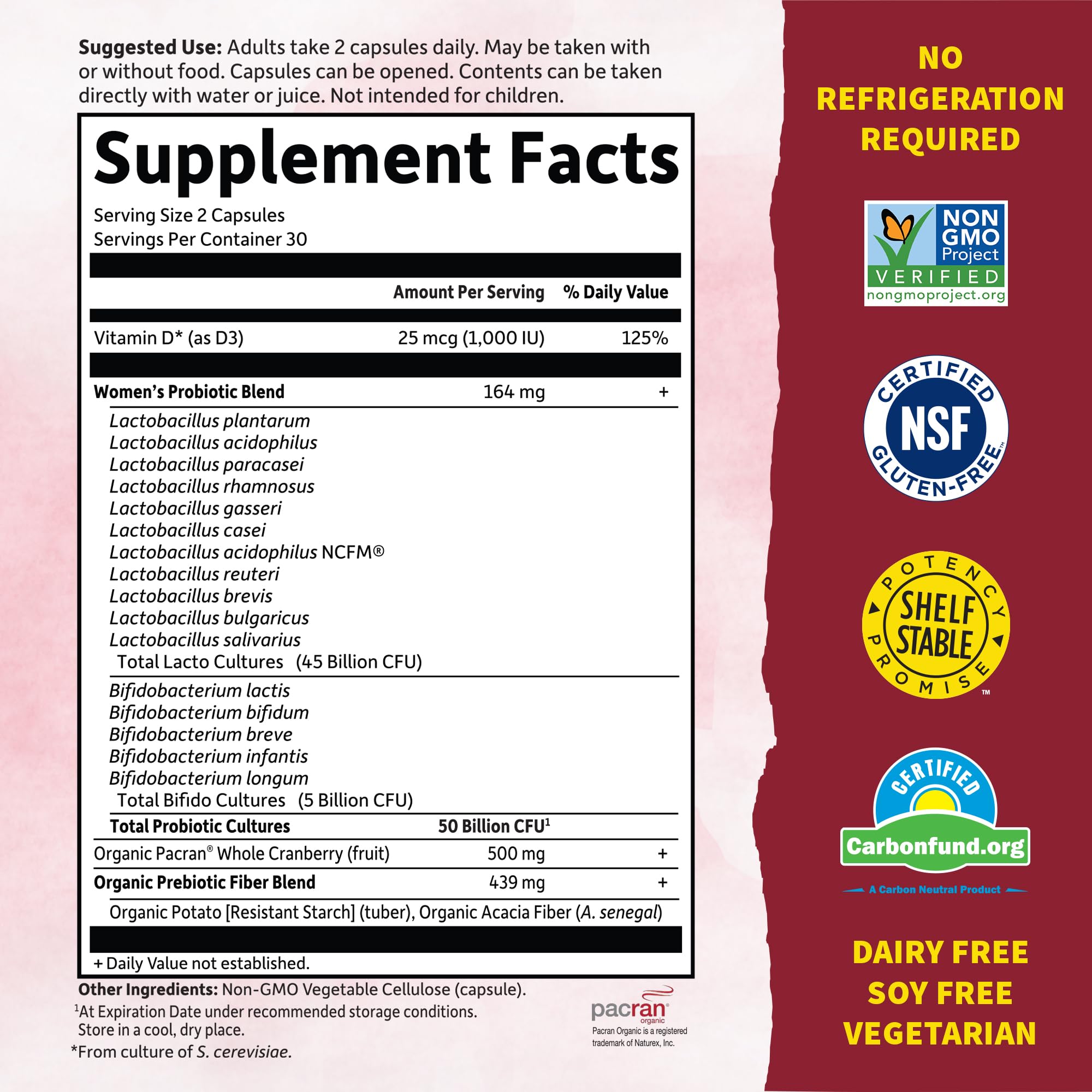 - CRANBERRY, PREBIOTICS AND VITAMIN D: This prebiotic supplement has 439mg Organic Potato and Organic Acacia prebiotic fiber to help feed good bacteria in the gut, 500mg Organic Pacran Whole Cranberry Fruit plus 1,000 IU Vitamin D3 for UT and immune health