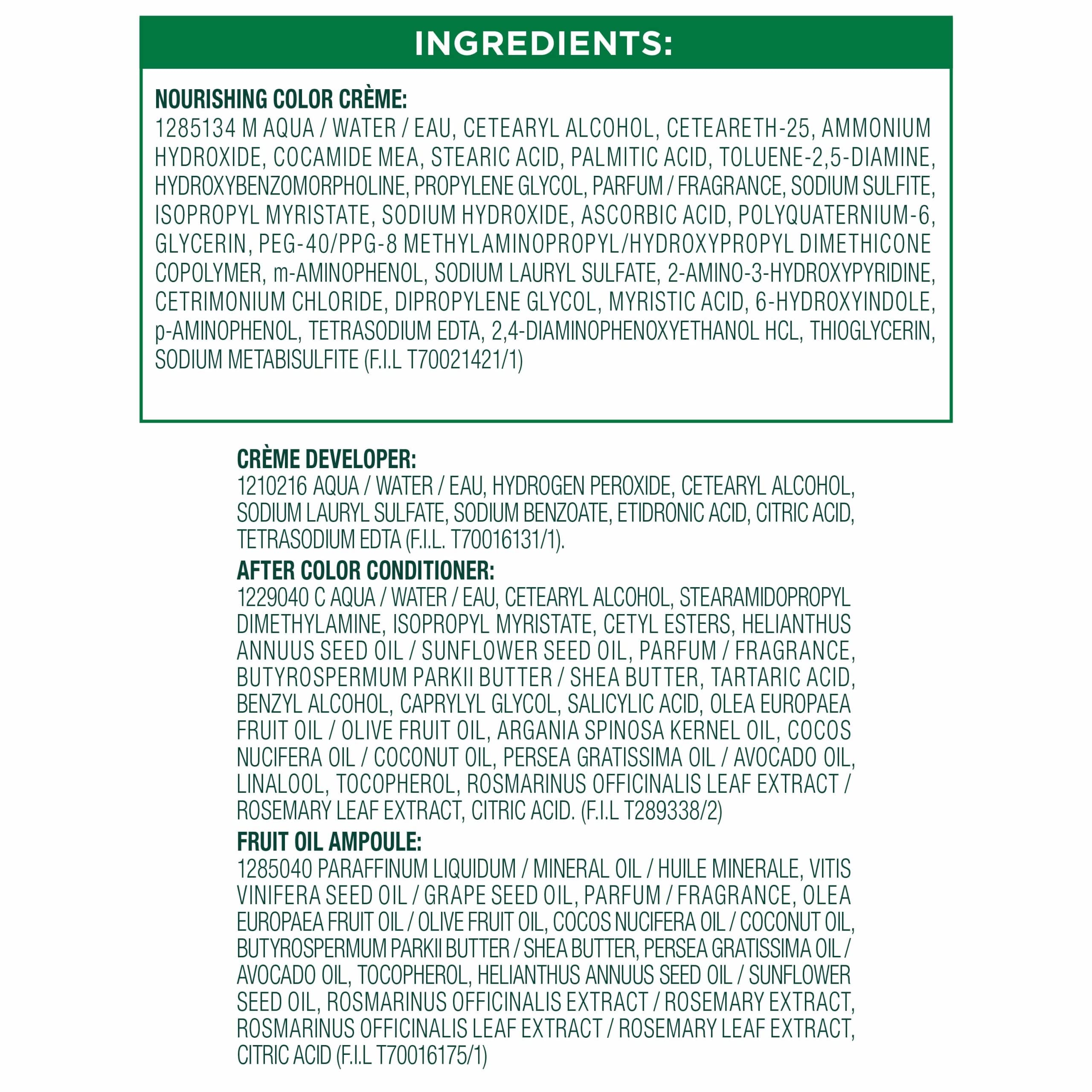 Garnier Nutrisse is the only permanent hair color creme that nourishes while you color with avocado, olive, and shea oils. The nourishing color creme enriched with fruit oil concentrate, penetrates deep into hair fibers to nourish and condition your hair so it takes color better and holds it longer, root-to-tip. Garnier Nutrisse delivers rich, radiant, long-lasting hair color with 100% grey coverage. ? Permanent, nourishing hair color creme with three fruit oils- avocado, olive, and shea ? The only hair color creme with a separate ampoule of grape seed oil to start nourishing as you color ? Rich, radiant, long-lasting color with 100 percent grey coverage ? Available in 45 Nourishing Shades Always read the hair color instructions insert in the box. Store between 50? and 80? F. Questions? Garnier Nutrisse has expert color consultants to help you. Call: 1-800-4GARNIER (1-800-442-7643). IMPORTANT: Hair color can cause an allergic reaction. Do not use if you?ve already had a reaction to a hair color product or if scalp is sensitive, itchy or damaged. Tattoos may increase risk of an allergic reaction. Do skin allergy test 48 hours before each use of this product. Don?t use over compound henna or progressive color. Wait at least 14 days after bleach, relaxing or perm before use. Don?t use on children. This is a safety summary. Read all labeling and instructions completely.