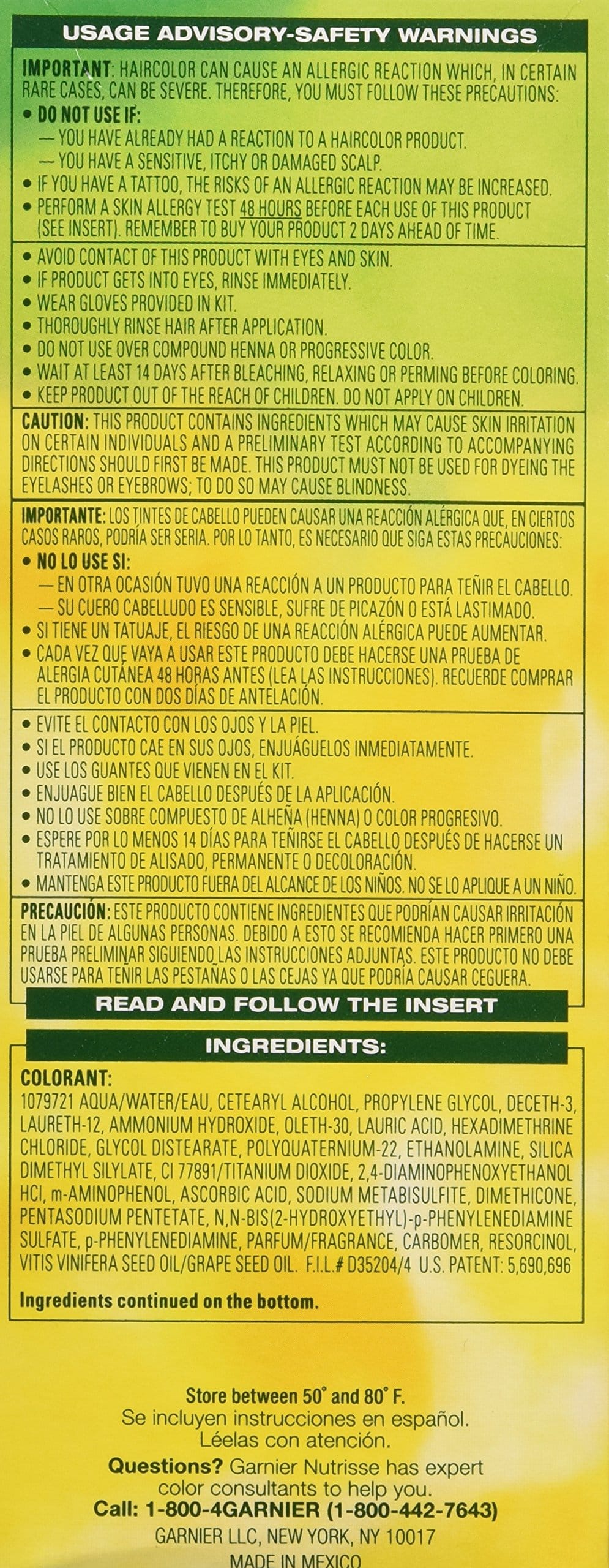 Garnier Nutrisse is the only permanent hair color creme that nourishes while you color with avocado, olive, and shea oils. The nourishing color creme enriched with fruit oil concentrate, penetrates deep into hair fibers to nourish and condition your hair so it takes color better and holds it longer, root-to-tip. Garnier Nutrisse delivers rich, radiant, long-lasting hair color with 100% grey coverage. ? Permanent, nourishing hair color creme with three fruit oils- avocado, olive, and shea ? The only hair color creme with a separate ampoule of grape seed oil to start nourishing as you color ? Rich, radiant, long-lasting color with 100 percent grey coverage ? Available in 45 Nourishing Shades Always read the hair color instructions insert in the box. Store between 50? and 80? F. Questions? Garnier Nutrisse has expert color consultants to help you. Call: 1-800-4GARNIER (1-800-442-7643). IMPORTANT: Hair color can cause an allergic reaction. Do not use if you?ve already had a reaction to a hair color product or if scalp is sensitive, itchy or damaged. Tattoos may increase risk of an allergic reaction. Do skin allergy test 48 hours before each use of this product. Don?t use over compound henna or progressive color. Wait at least 14 days after bleach, relaxing or perm before use. Don?t use on children. This is a safety summary. Read all labeling and instructions completely.