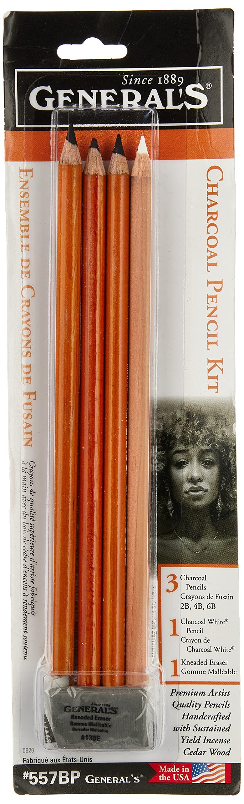 • General’s Charcoal Drawing Kit comes with 5 non-toxic, latex-free pieces, including three charcoal pencils (6B, 4B, 2B), one white charcoal pencil and one kneaded eraser. Eraser is perfect for fine work and for removing charcoal from areas. White pencil is ideal for highlights and works well as a wash-out pencil for marking on fabrics.