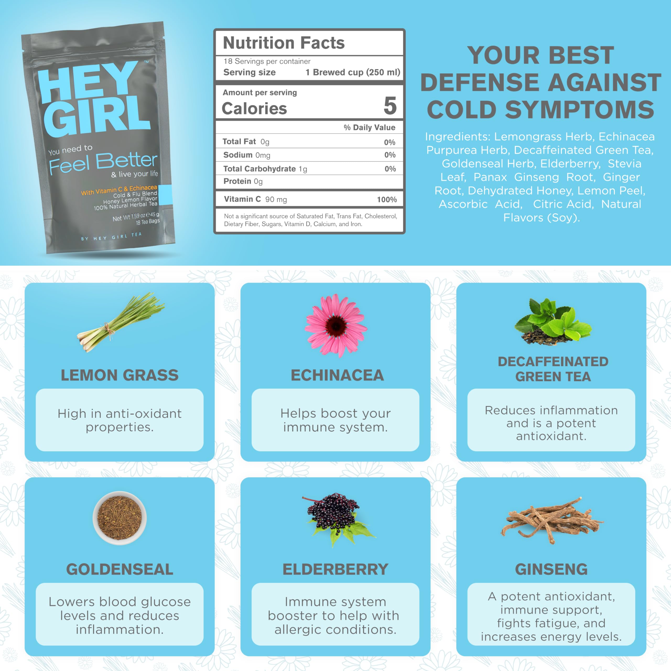 • All Natural & Caffeine Free – Lemongrass, Echinacea Purpurea, Decaffeinated Green Tea, Dehydrated Honey, Goldenseal, Elderberry, Lemon Peel, Stevia Leaf, Panax Ginseng Root, Ascorbic Acid, Citric Acid, Ginger Root, Natural Flavors (Soy) are all traditional herbs known to support immunity, health and wellness. These herbs help fight small to severe symptoms by boosting the body’s natural defenses.