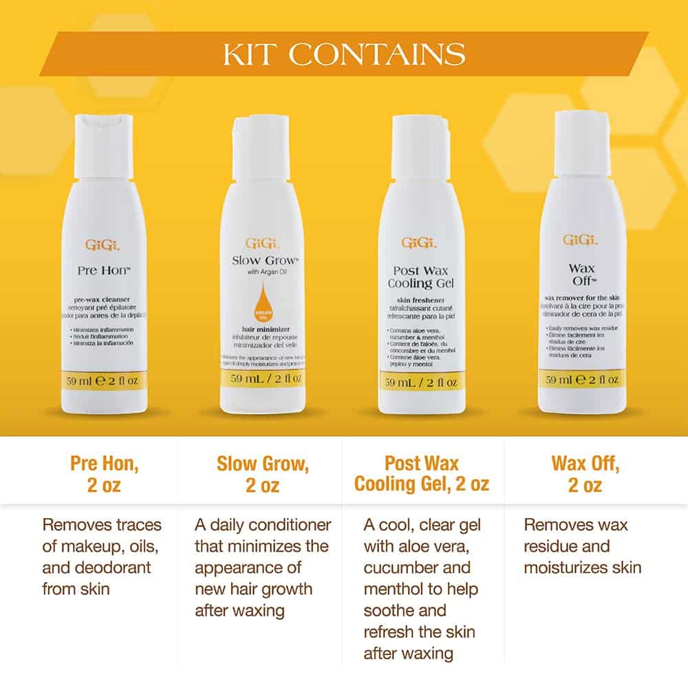 - Ultimate Trial-Pack: Contains Pre Hon for removing dirt and grime before waxing; with Wax-Off for getting rid of excess hair removal wax after treatment; clear Cooling Gel for instant relief of newly epilated skin; and Slow Grow for delaying hair regrowth