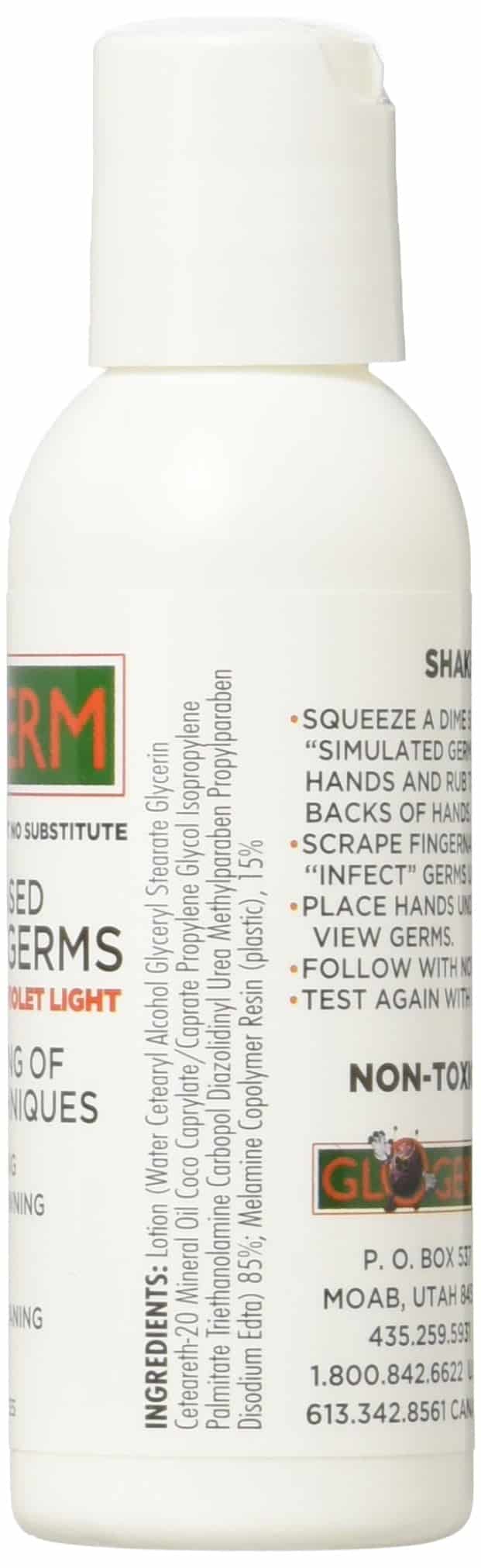 Glo Germ Mini Kit Introducing the new Mini Glo Germ kit. The mini kit is a disposable kit designed to teach up to 25 people proper handwashing. Great idea for teaching smaller groups or a onetime training. The mini kit contains 1 – 2oz bottle of gel a ultra-violet Keychain Light OR ultra-violet Pen Light informative Trainers Manual. In order to use the Keychain light, just squeeze the purple center in one hand. While bracing the silver part against your other hand, slide the purple part forward until it locks in place. Light will stay on as long as it is locked in place. The Glo Germ products demonstrate germ communication, cross-contamination, effectiveness of sanitary practices, and more! Illuminate the weaknesses in your techniques with Glo Germ and protect yourself, your customers, and your bottom line! In this age of concern over infectious diseases, security, and liability, Glo Germ is an effective tool to demonstrate handwashing, surface cleaning, hygiene, and containment techniques. It is a big mistake to assume that your employees understand the critical nature of these simple processes. You have to teach them! Not enough can be said about the importance of cleanliness, proper handwashing and infection control. Since 1968, Glo Germ has provided customers with a fun and safe product that casts a revealing glow when exposed to Glo Germ?s U.V. light, turning the invisible into germs you can see!