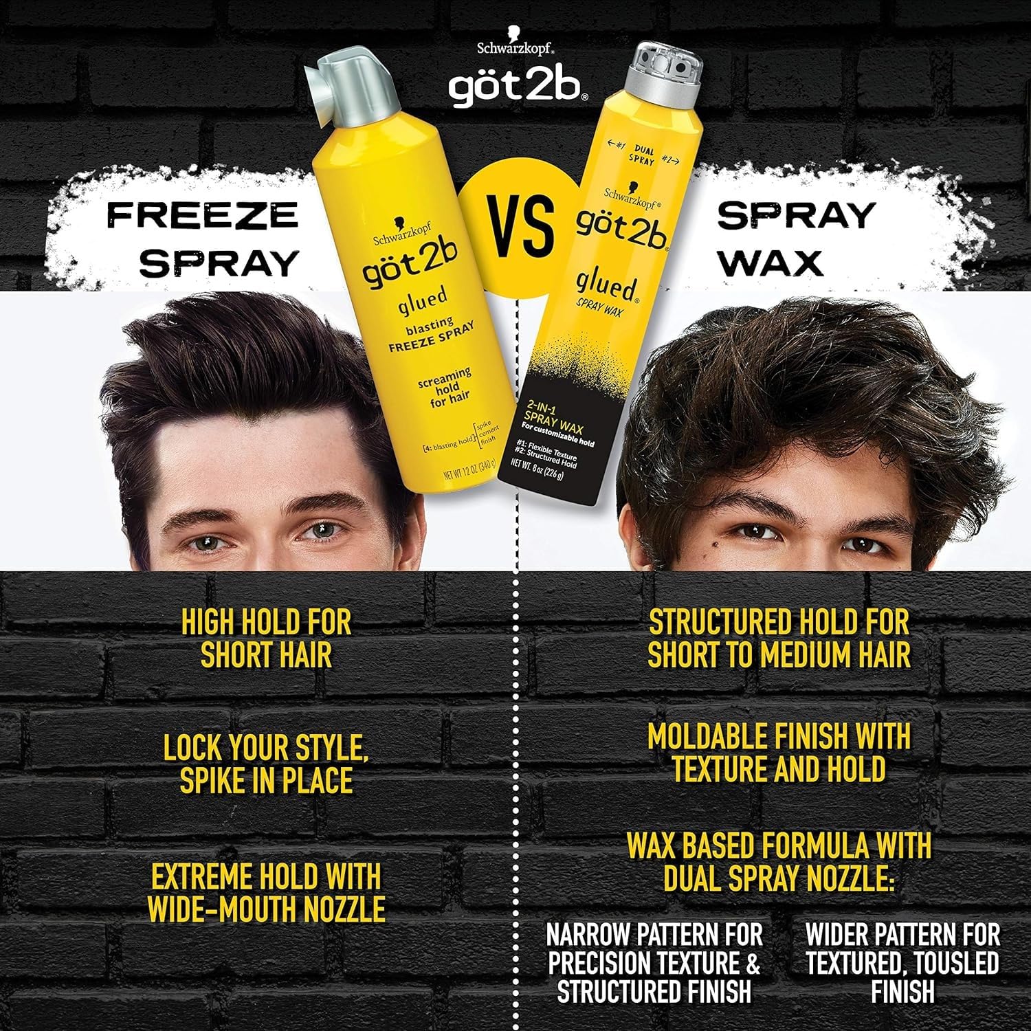Freeze that style into place with got2b Blasting Freeze Spray. Spray through hair carelessly for that sexy, messy look or twist tips into spikes for outrageous hold that will last until your next shampoo. Only for stuck up styles and extreme rock hard hair. Cool Tip: For over the top spikes, spray heavily and twist tips. Allow to dry and finish with an additional blast. For that messy look, spray hair from root to end and massage with fingertips in a circular motion. Finish with a direct blast to cement your style. To scrunch, layer Glued Spiking Glue through wet hair and finish with blasting freeze spray.