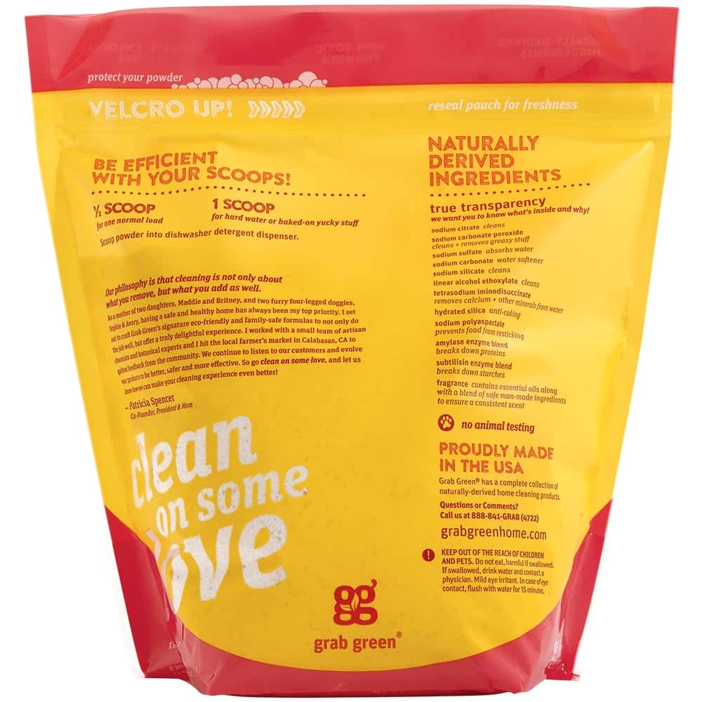 Grab Green Automatic Dishwashing Detergent Powder provide a superior cleaning experience, powerful grease removal, and a brilliant shine. Made with naturally-derived ingredients, our non-toxic formula provides an effective clean without harsh smelly chemicals or known carcinogens. This powerful powder easily cut through grease, grime and stuck on food and the clean rinse-formula means film-free, spot-free dishes every time?and zero residue left behind. Our refreshing and bright grapefruit with cranberry fragrance is made with grapefruit and orange essential oils. We responsibly source the highest quality plant and mineral-based ingredients and work directly with our team of organic chemists to create the most effective, naturally-derived, non-toxic formulas. Our thoughtful packaging includes a convenient, easy to use velcro closure, a measuring scoop for easy and efficient measuring, and clear use instructions. We believe in full ingredient disclosure?what we call True Transparency?which is why we list every ingredient and the purpose for each ingredient on every package. Grab Green is a female and mother owned and operated company that provides naturally derived and non-toxic laundry, home cleaning, and personal care products 100% made in the USA. Our products are eco-responsible and ensure safe and effective cleaning power for a healthy, happy home.
